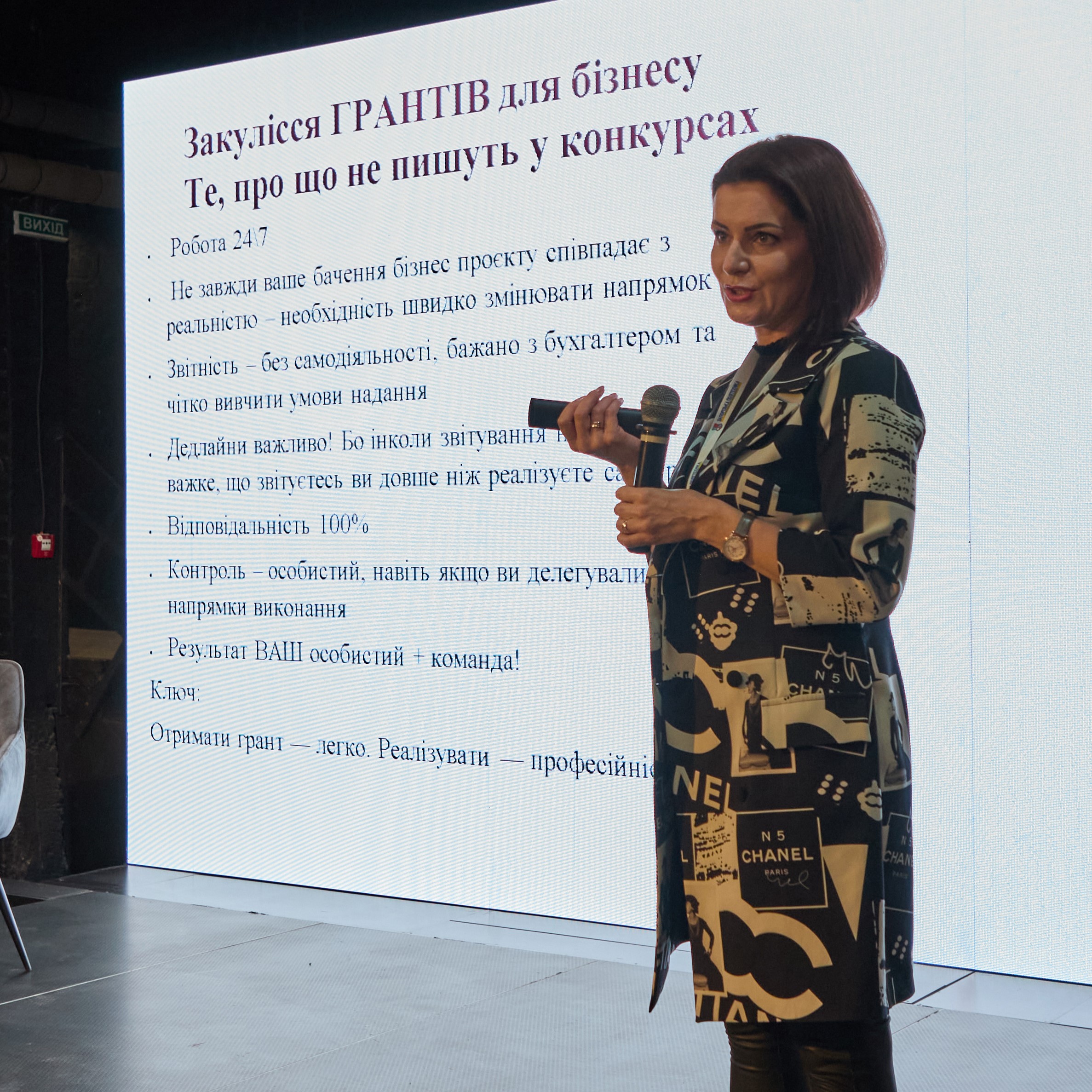Першою в основній частині виступила фахівчиня із залучення грантів і координаторка грантових проєктів для підприємців Людмила Сірко. Вона розповіла як пройти шлях від ідеї до профінансованого бізнес-проєкту навіть у прифронтовому Запоріжжі!