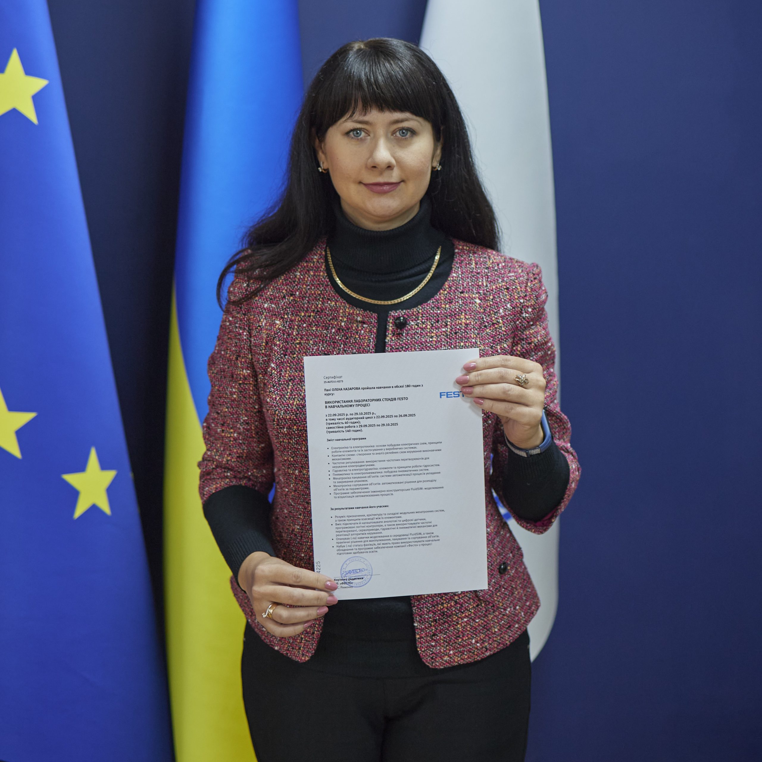 Олена Назарова та Володимир Осадчий отримали сертифікати від ДП «ФЕСТО» і набули статусу сертифікованих фахівців, які можуть використовувати навчальне обладнання та програмне забезпечення компанії FESTO в підготовці здобувачів освіти.