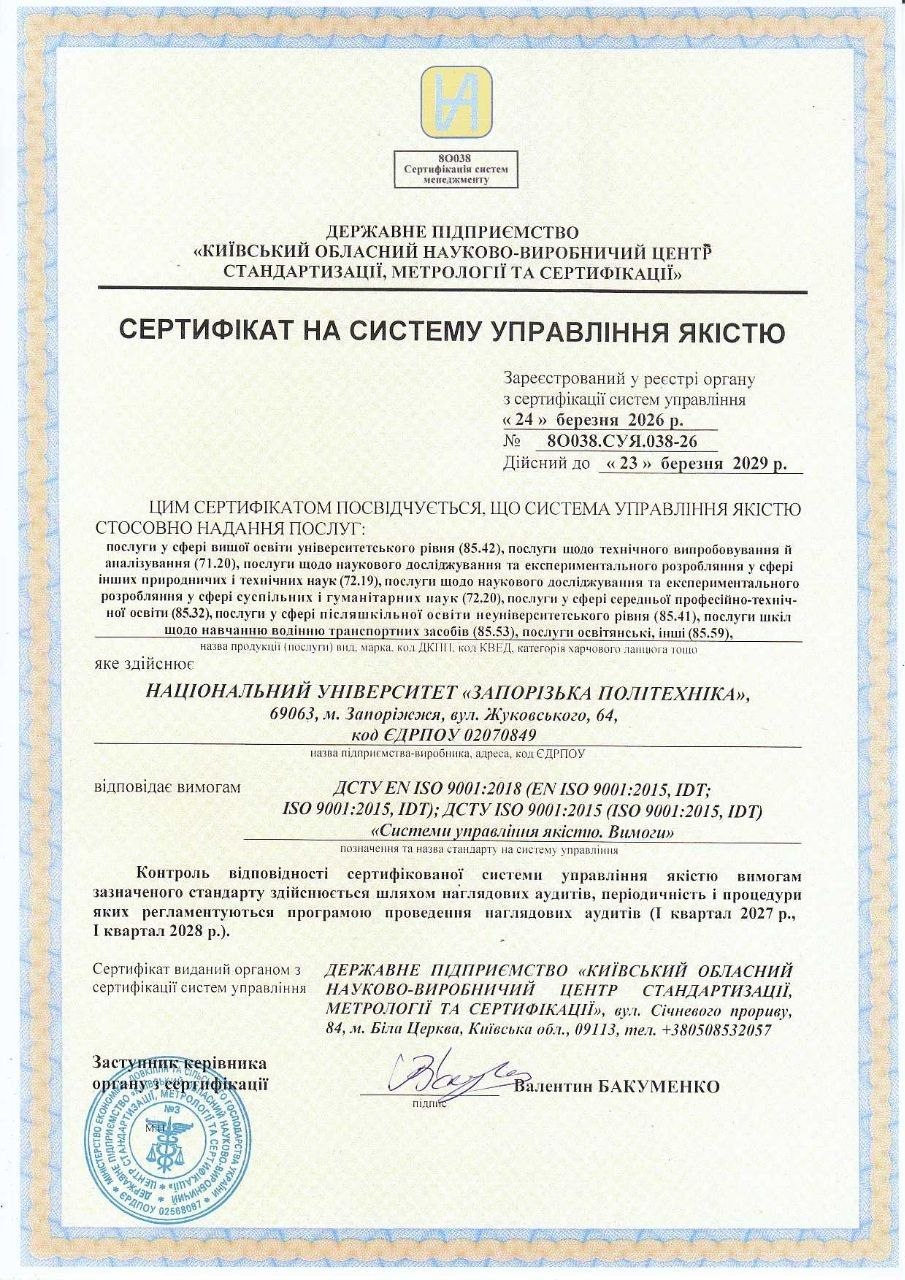 Zaporizhzhia Polytechnic National University has a certified quality management system. Its compliance with established requirements is confirmed by a certificate issued by an authorized certification body. The presence of a certified quality management system demonstrates that the university operates based on structured, documented, and controlled procedures focused on process effectiveness, responsibility, transparency of management decisions, and continuous improvement.