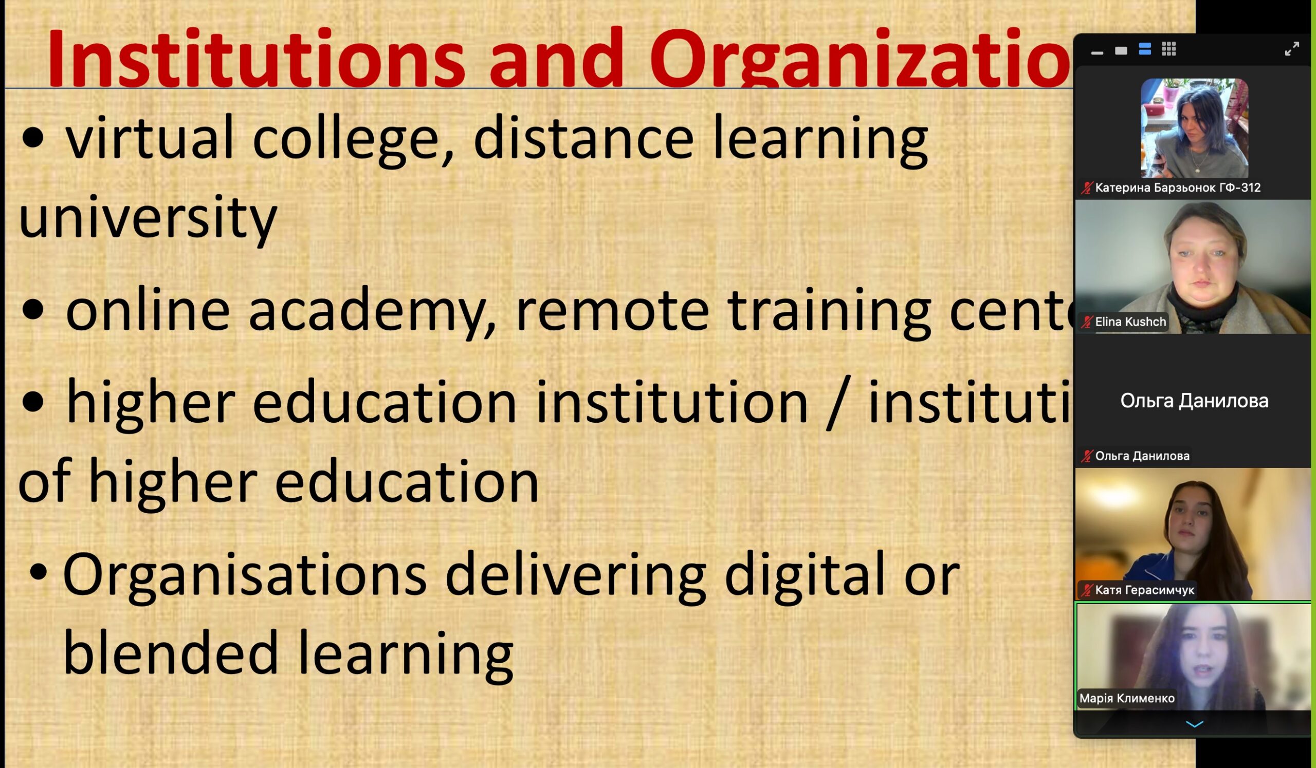 – students of GF-415 Maria Klymenko «Thematic Groups of English E-Learning Vocabulary» (scientific supervisor – associate professor of the Department of Foreign Philology and Translation Elina Kushch)