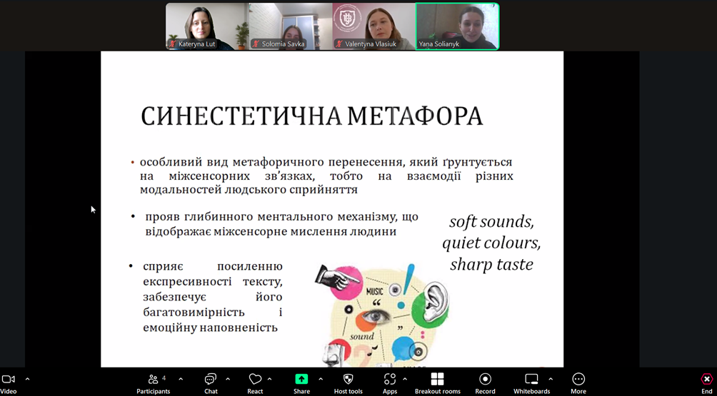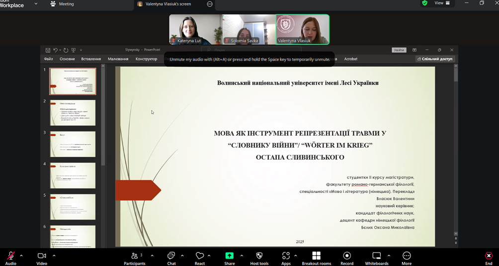 The work of the sections was devoted to the study of complex aspects of language as a tool of communication and culture. The participants focused on the analysis of discursive-textual systems, consideration of current problems of terminology and industry translation in the context of technological changes and European integration. A significant block of works covered the issues of linguopoetics, stylistic interpretation of works of art and intercultural communication. Special attention was paid to the methodology of teaching foreign languages, in particular the integration of artificial intelligence, the development of intercultural competence and improving the quality of language education.