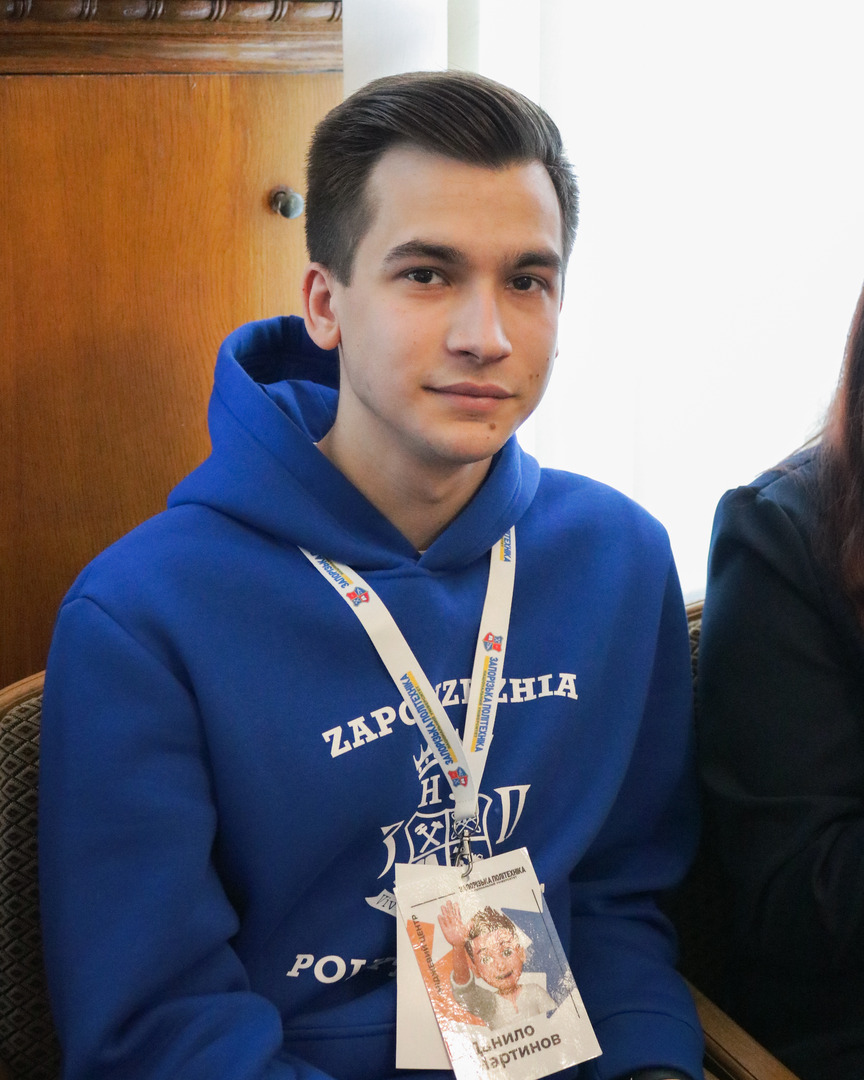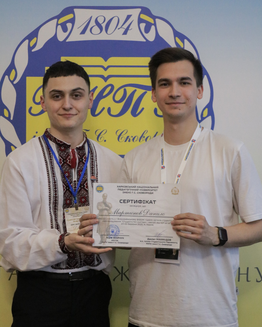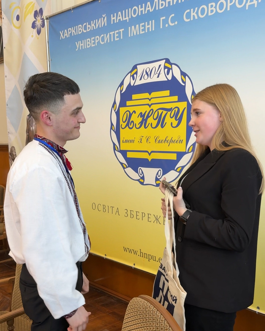 Ms. Sofia handed over the branded merchandise of Zaporizhia Polytechnic to the acting chairman of the student parliament of the G.S. Skovoroda KhNPU Daniil Makhmudov, and he, in turn, awarded the participants with certificates!