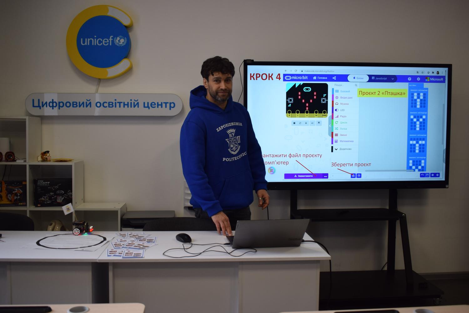 Associate Professor of the Department of Electric Drive and Automation of Industrial Installations Yevhen Potapenko and Director of the Children’s and Youth Scientific University Olena Nazarova organized the location “Do it with Micro:bit”. They introduced students to the prospects of developing projects based on the Micro:bit board, and also implemented exciting activities together with schoolchildren: