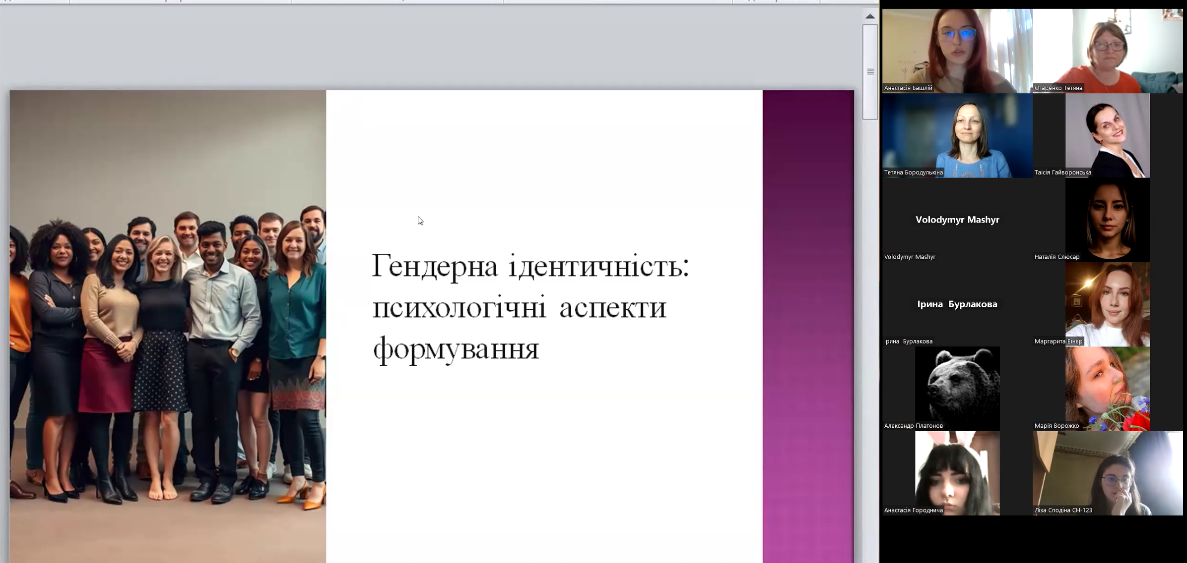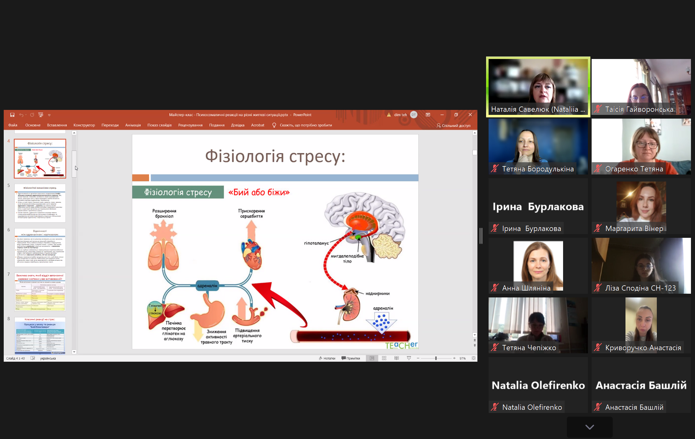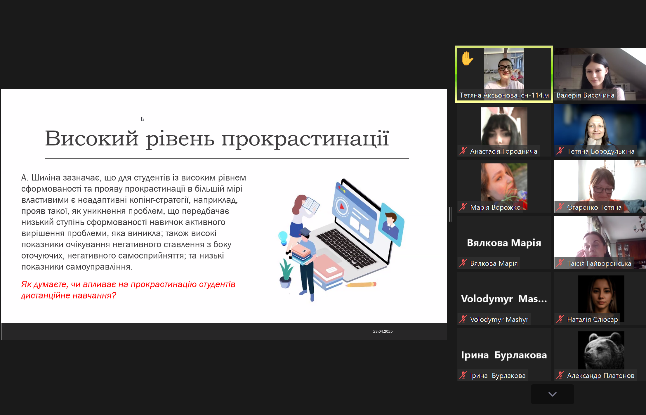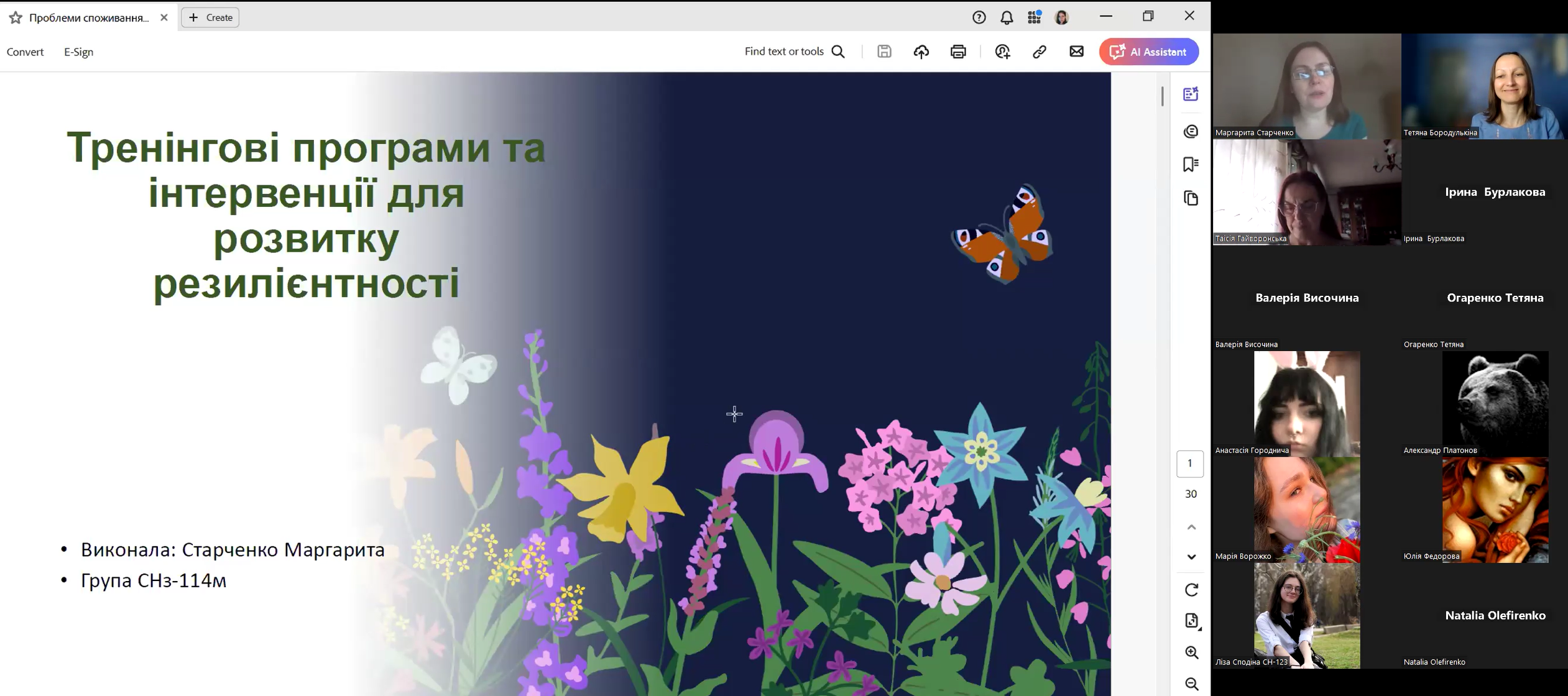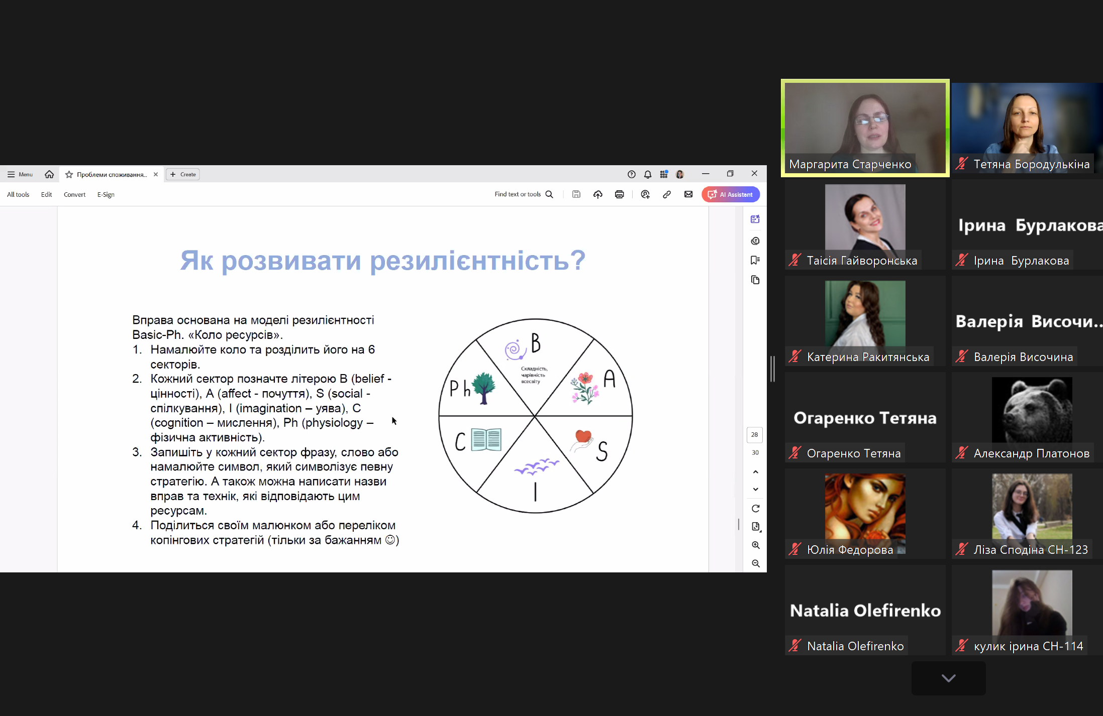 ?Master’s student in Psychology (СНз–114м) Margarita Starchenko, who this year became one of the winners of the 1st stage of the All-Ukrainian Competition of Student Scientific Papers in Psychology, held a thorough mini-lecture with a workshop on the topic “Training Programs and Interventions for Developing Resilience”, during which she also offered resourceful practical exercises.