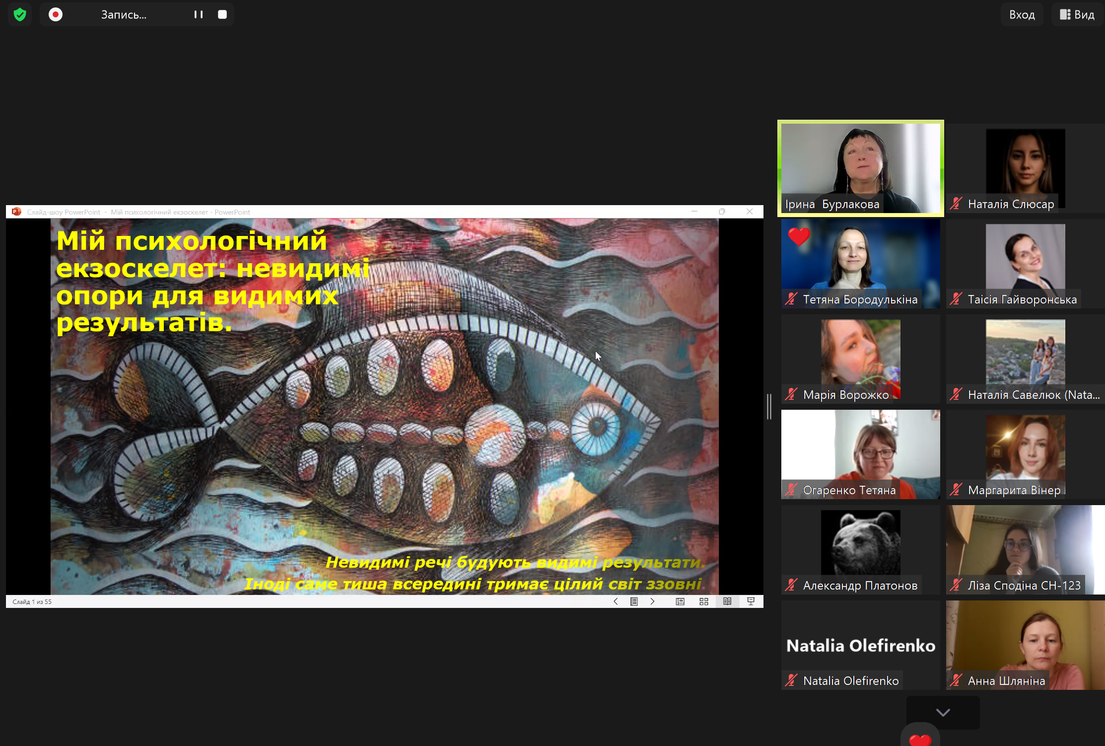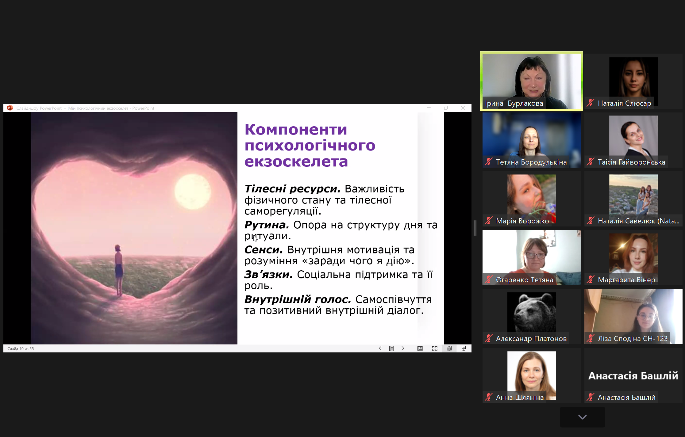 ?Professor of the department Iryna Burlakova held a master class on the topic “My psychological exoskeleton: invisible supports for visible results”, which inspired active action. Participants learned about key psychological supports — from bodily resources to the inner voice, received practical tools to strengthen them