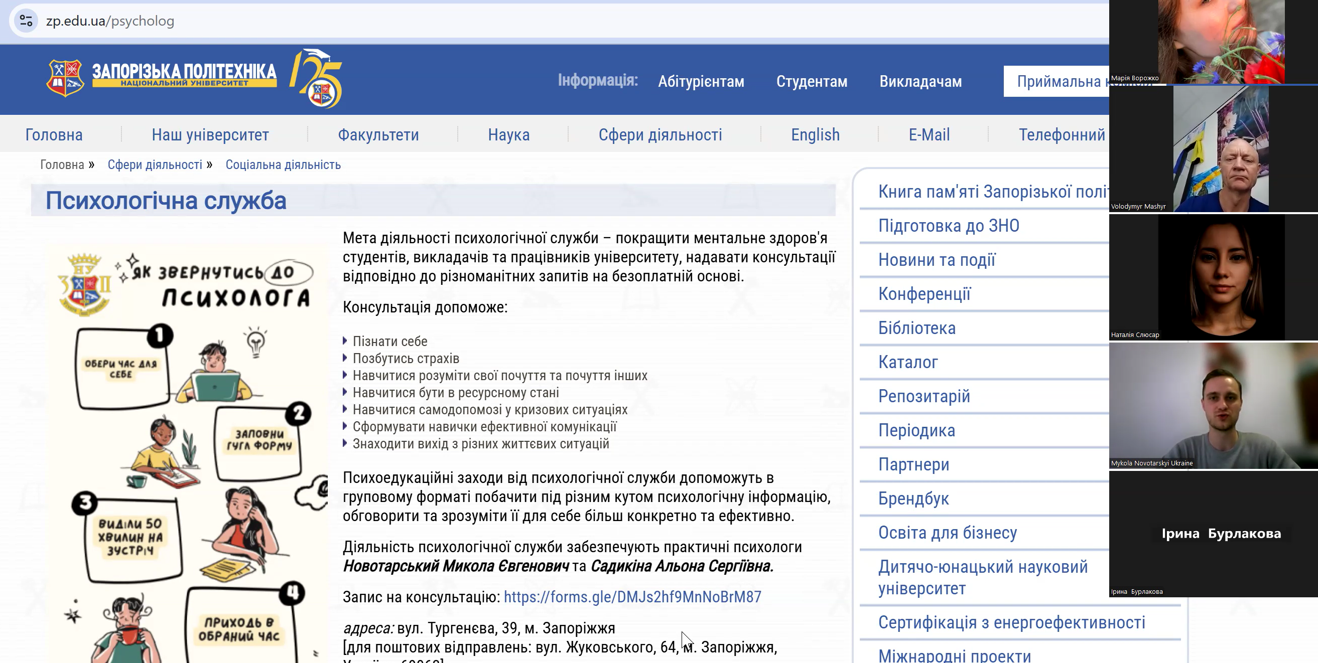 ?practical psychologist of the Zaporizhia Polytechnic National University, trainer and consultant of WHO scaled interventions Mykola Novotarsky spoke about the main tasks and challenges of the psychological service of the higher education institution, about the main areas of work of the Psychological Service of our university, invited applicants of the department to practice and reminded about the possibility of receiving free psychological assistance for applicants of our university
