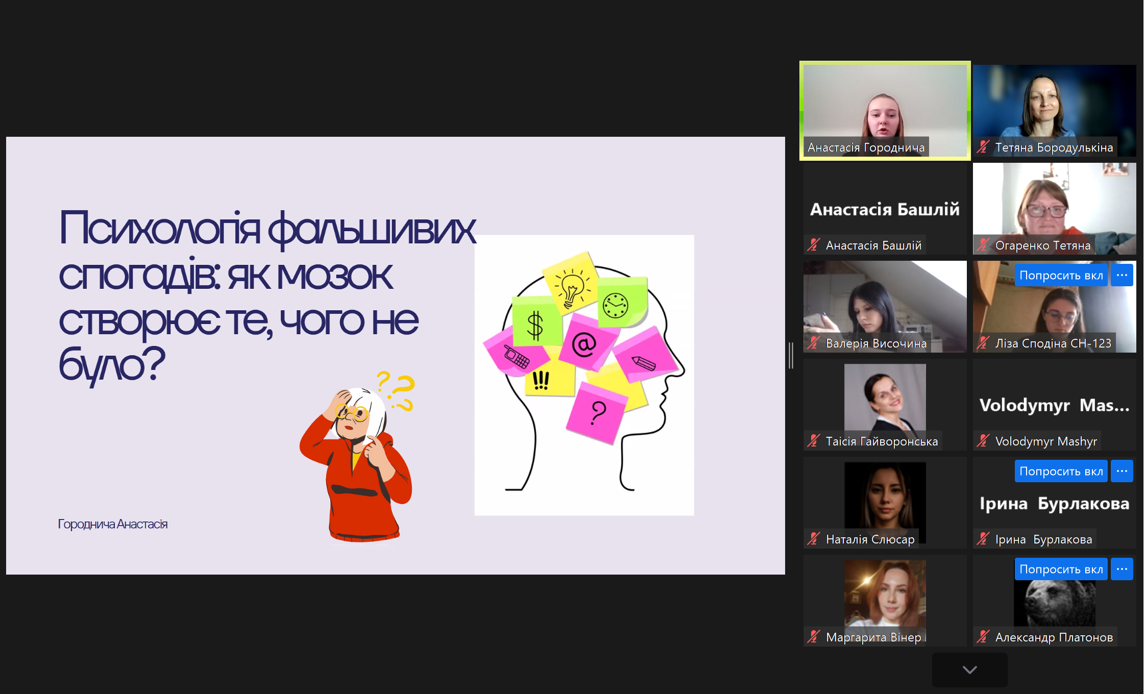 Students in Psychology (СН–111 group), who this academic year developed their own mini-lectures on topical topics while studying the OK “Psychology Teaching Methods”, added bright colors to our holiday. Anastasia Bashliy gave a mini-lecture followed by an active discussion on the topic “Gender Identity and Sexuality: A Modern Approach in Psychology”. Anastasia Gorodnycha gave a mini-lecture on the topic “Psychology of False Memories: How the Brain Creates What Wasn’t There?”, which aroused great interest among the audience. Valeria Vysochyna interested everyone in the topic of procrastination in her mini-lecture with a workshop on the topic “Why Do We Procrastinate? Psychology of Procrastination”; the lecture aroused lively interest in the audience and touched the hearts of many participants.