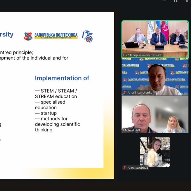 Zaporizhzhya Polytechnic was represented by the rector of the university Viktor Greshta, first vice-rector Serhiy Shylo, vice-rector Andriy Ivanchenko and the head of the Center for Internationalization and International Cooperation Alina Kazurova. Dr. Michael Hall, External Affairs office, Coordinator, European Alliance University, joined the meeting from the side of the Munster Technological University.