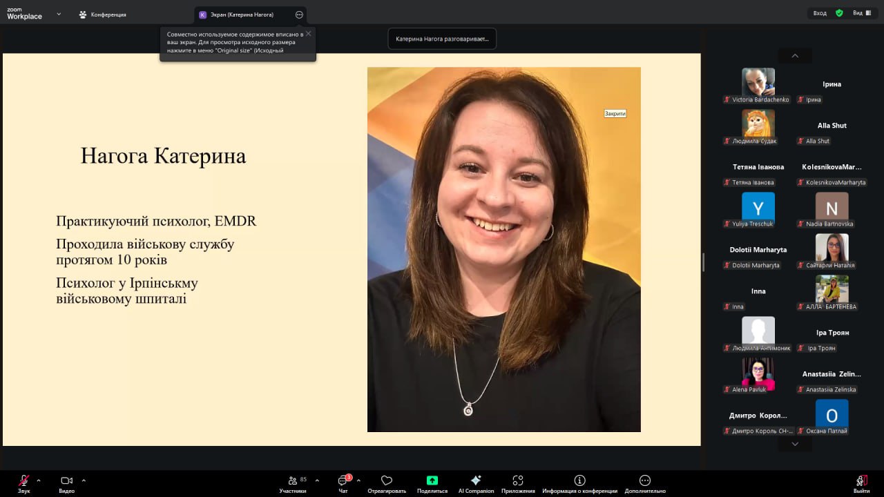 The first lecture “Rules and Principles of Communication with the Military” brought together more than 100 participants from among psychologists, education seekers, and non-specialist participants who are interested in this topic. The lecturer was Kateryna Nagoga, a military psychologist who served in the military for 10 years and now works at the Irpin Military Hospital.