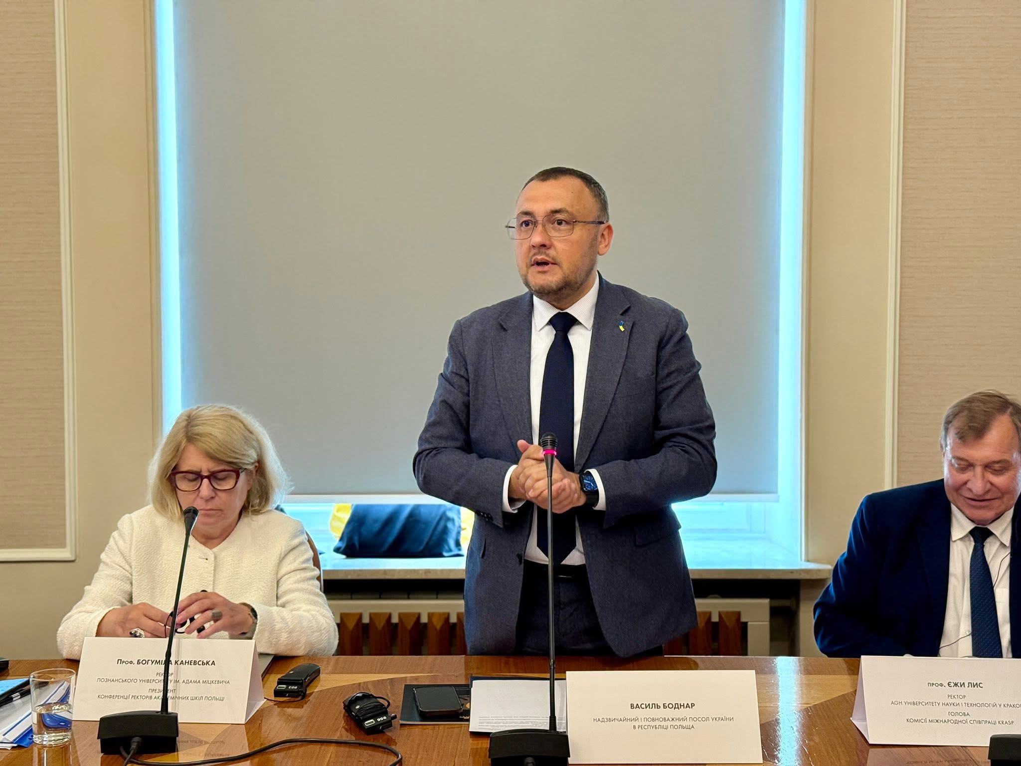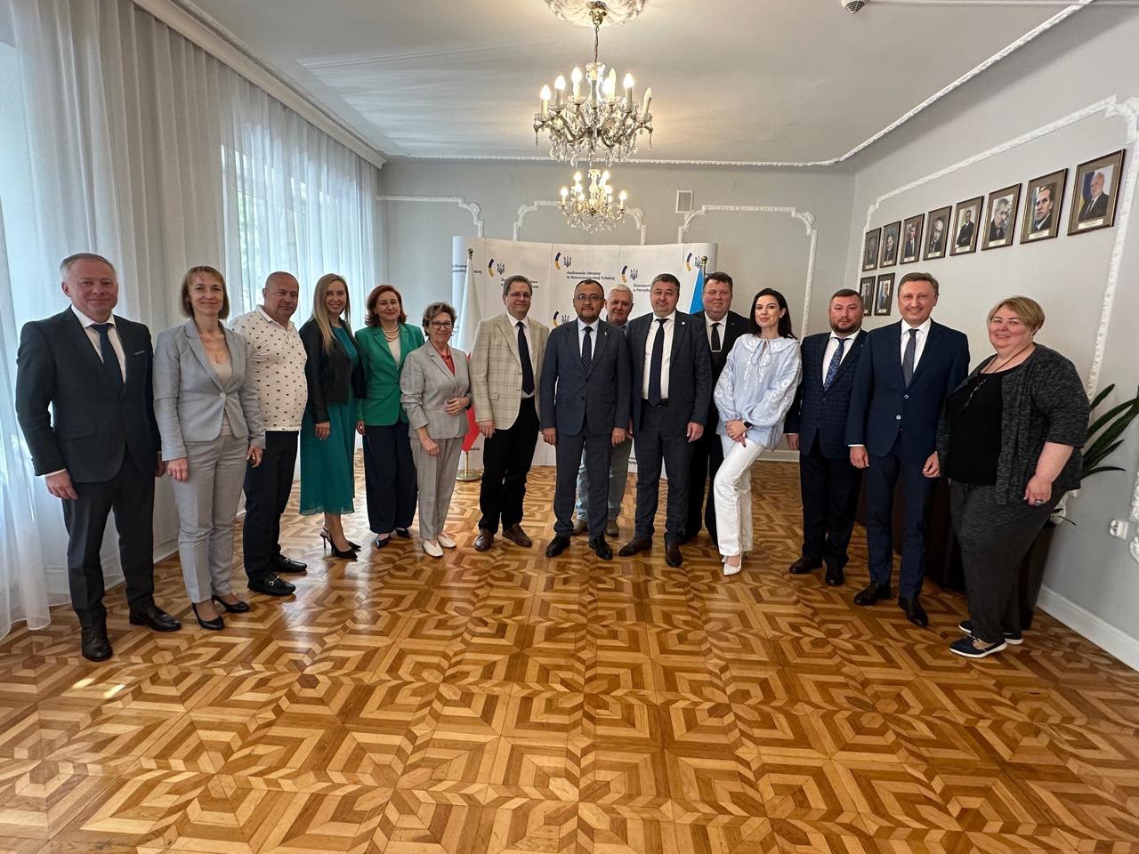 During the second day, Rector Viktor Greshta and his colleagues met with the Ambassador of Ukraine Vasyl Bodnar at the Embassy of Ukraine in the Republic of Poland. They discussed the importance of involving Ukrainian youth temporarily abroad in the educational process in Ukraine: organizing distance learning and opportunities for admission to Ukrainian higher education institutions.