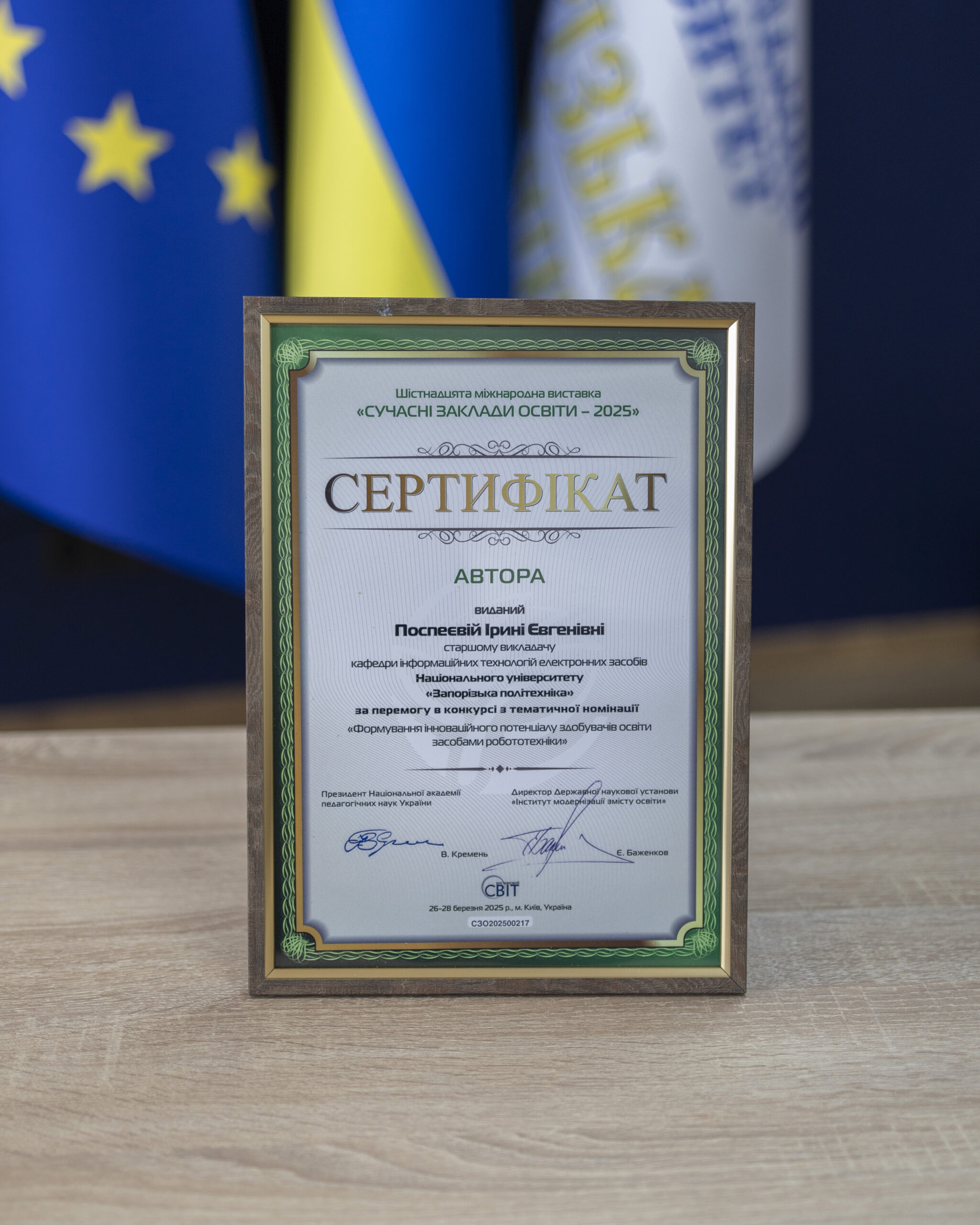 The competitive work in the nomination “Mr. 4 Formation of innovative potential of education seekers by means of robotics” was prepared by the rector of Zaporizhzhia Polytechnic University Viktor Greshta, the dean of the faculty of information security and electronic communications Natalia Furmanova and the senior lecturer of the department of information technologies of electronic means Iryna Pospeyeva.