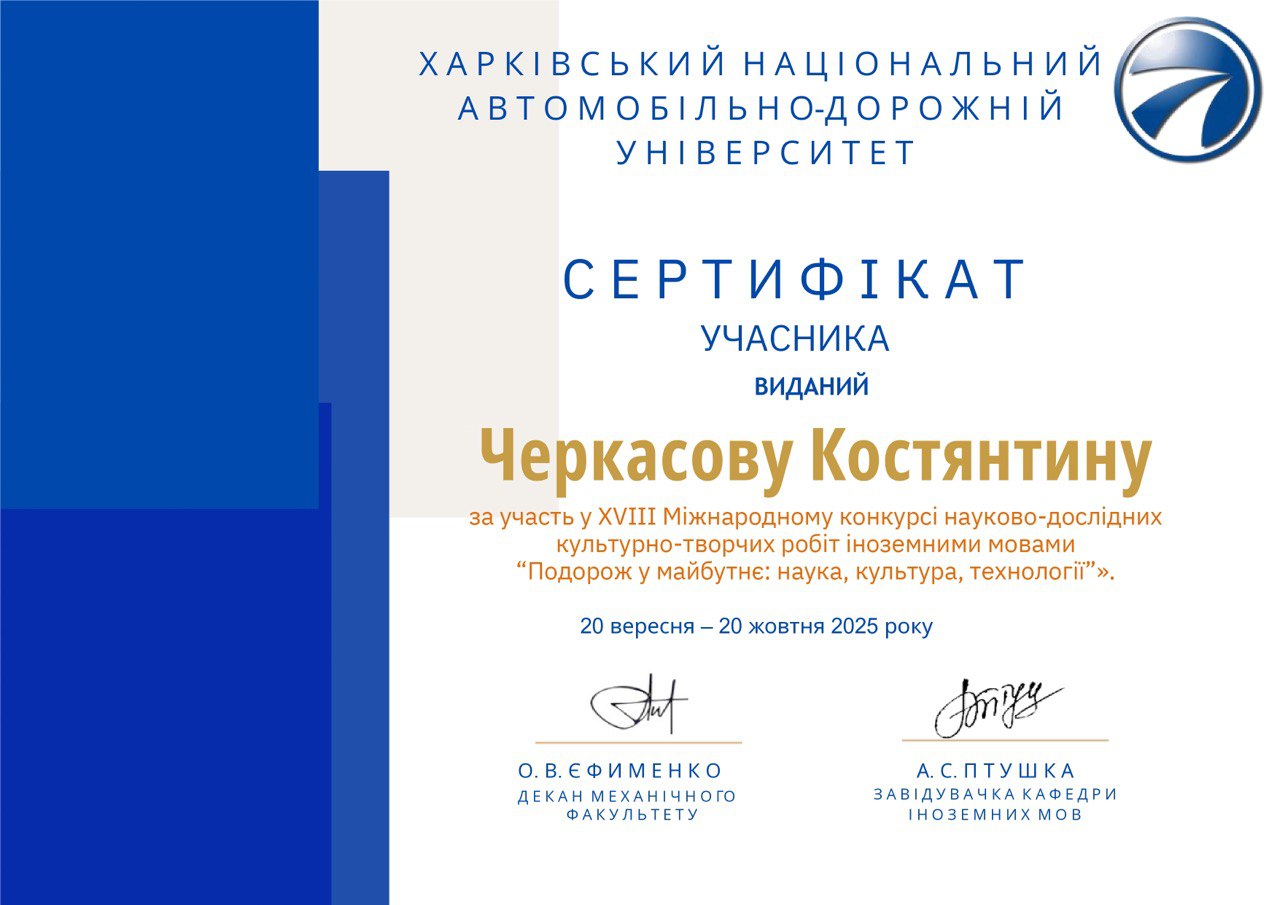 Two more students of Zaporizhzhia Polytechnic University – Kostyantyn Cherkasov (IF-315m) and Yevhen Shevchenko (T-315m) – were awarded participant certificates.