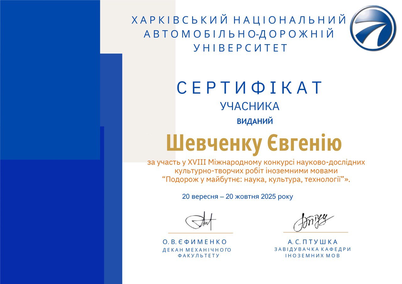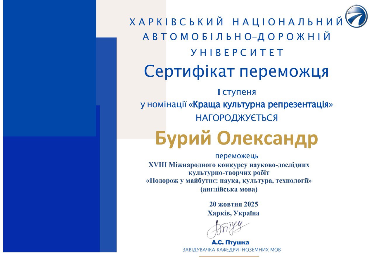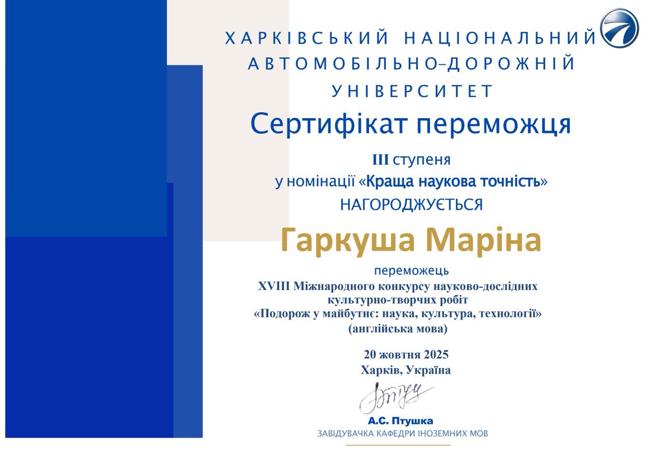 Students of Zaporizhzhia Polytechnic University took part in the XVIII International Competition of Scientific Research, Cultural and Creative Works in Foreign Languages ”Journey to the Future: Science, Culture, Technology” (English), which was held at the Kharkiv National Automobile and Road University.