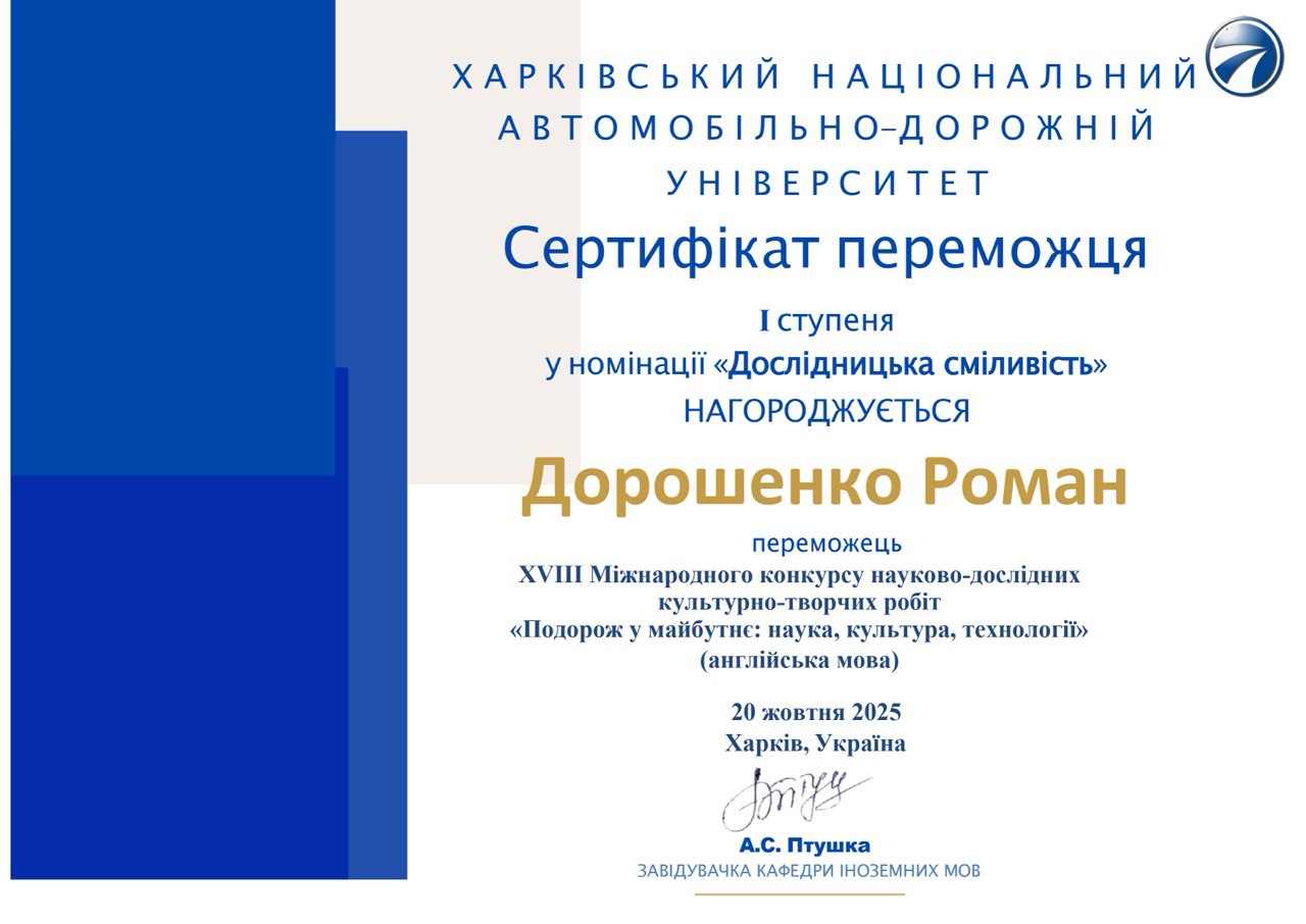 1st place in the nomination “Research Courage” — Roman Doroshenko, GF–313