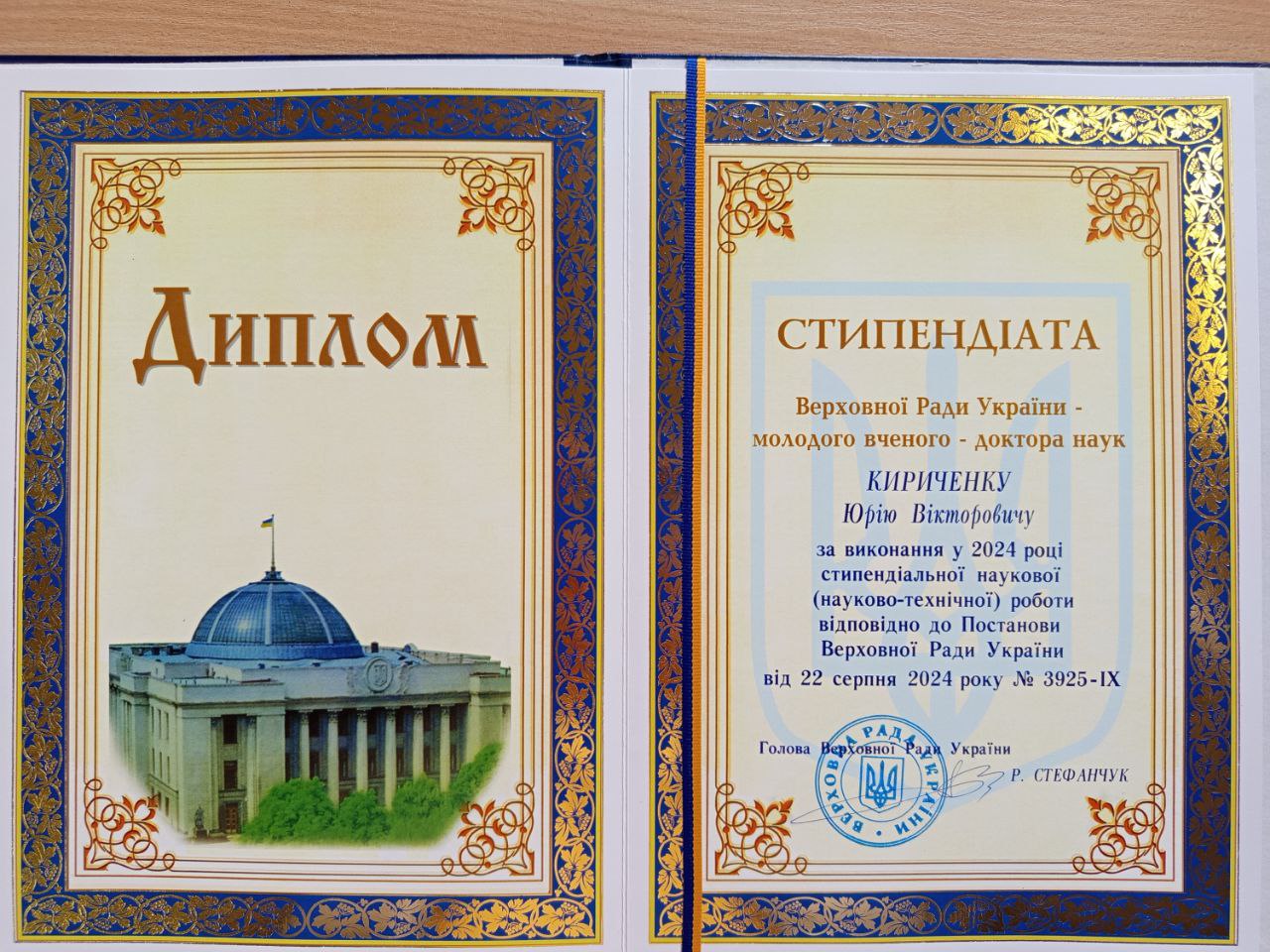 Head of the Department of Political Science and General Legal Disciplines, Doctor of Law, Professor Yuriy Kirichenko received a diploma of a scholarship holder of the Verkhovna Rada of Ukraine for a young scientist-doctor of sciences for performing scholarship scientific (scientific and technical) work in 2024 in accordance with the Resolution of the Verkhovna Rada of Ukraine dated August 22, 2024 No. 3925–IX.