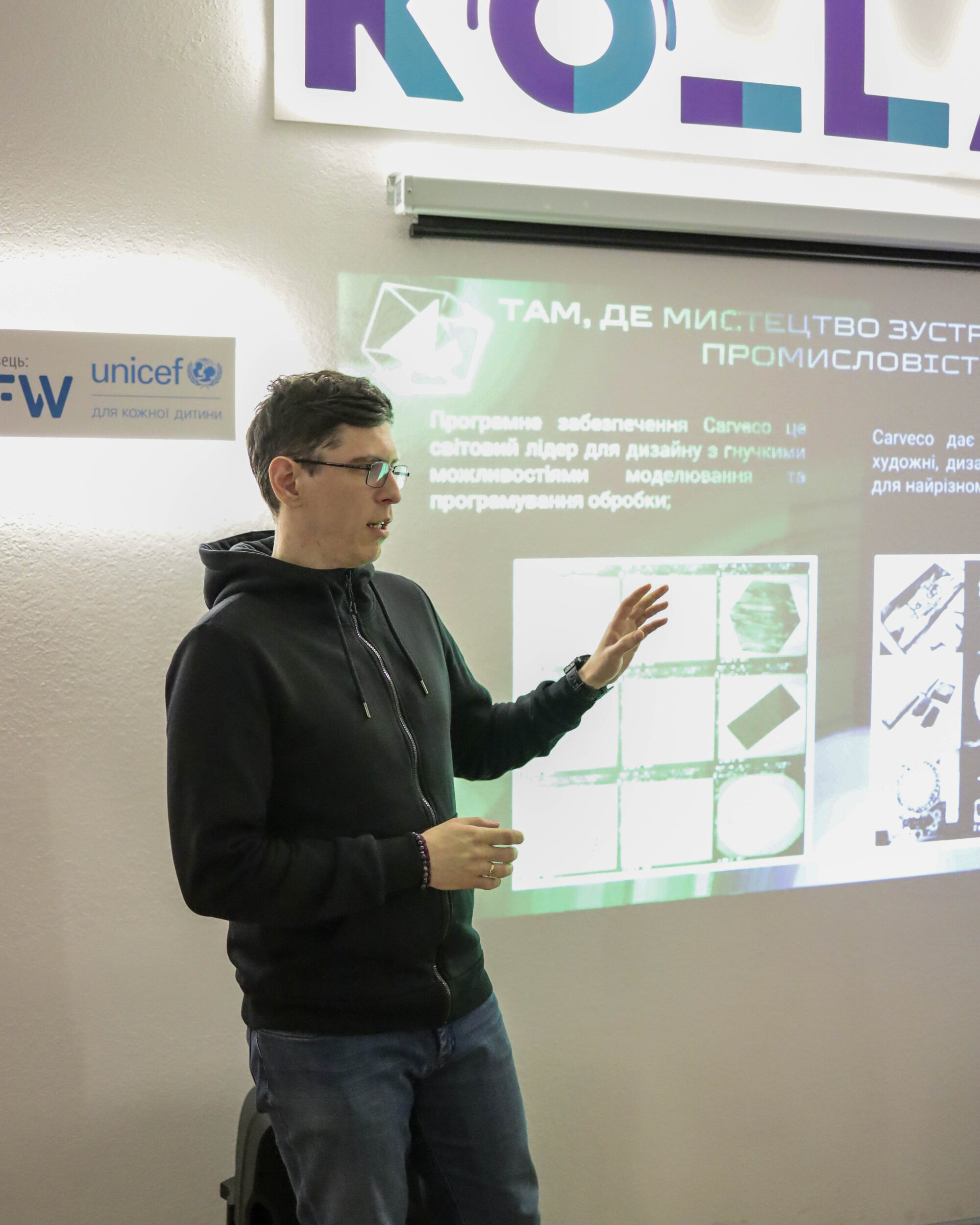 Старший викладач кафедри металорізальних верстатів та інструментів Сергій Танченко ознайомив учасників із базовими поняттями створення 3D-моделей у британському програмному забезпеченні Carveco. Він продемонстрував роботу сучасного верстата та показав, як цифрові моделі застосовуються для виготовлення реальних деталей.