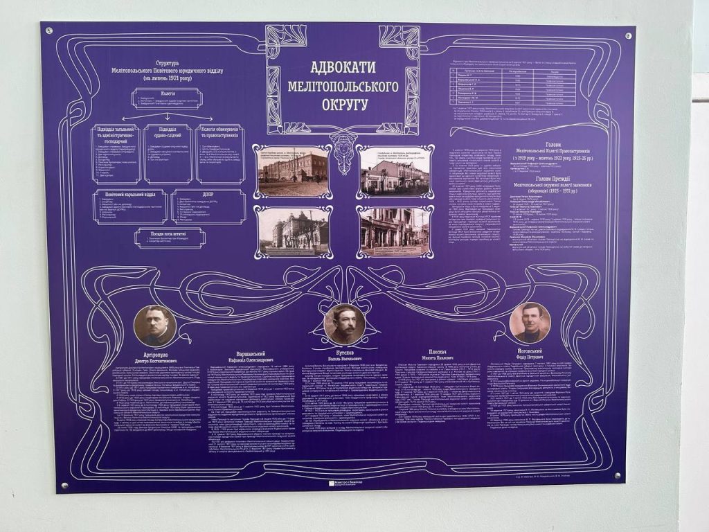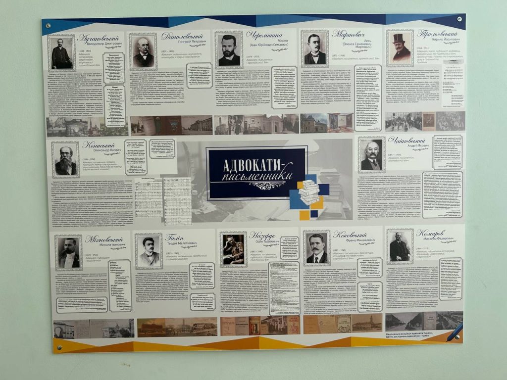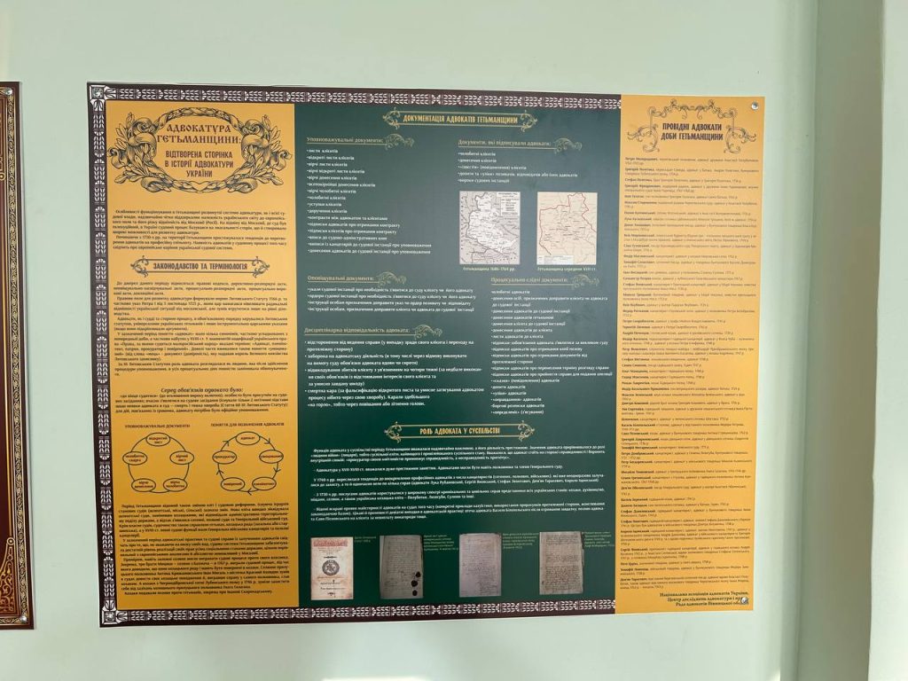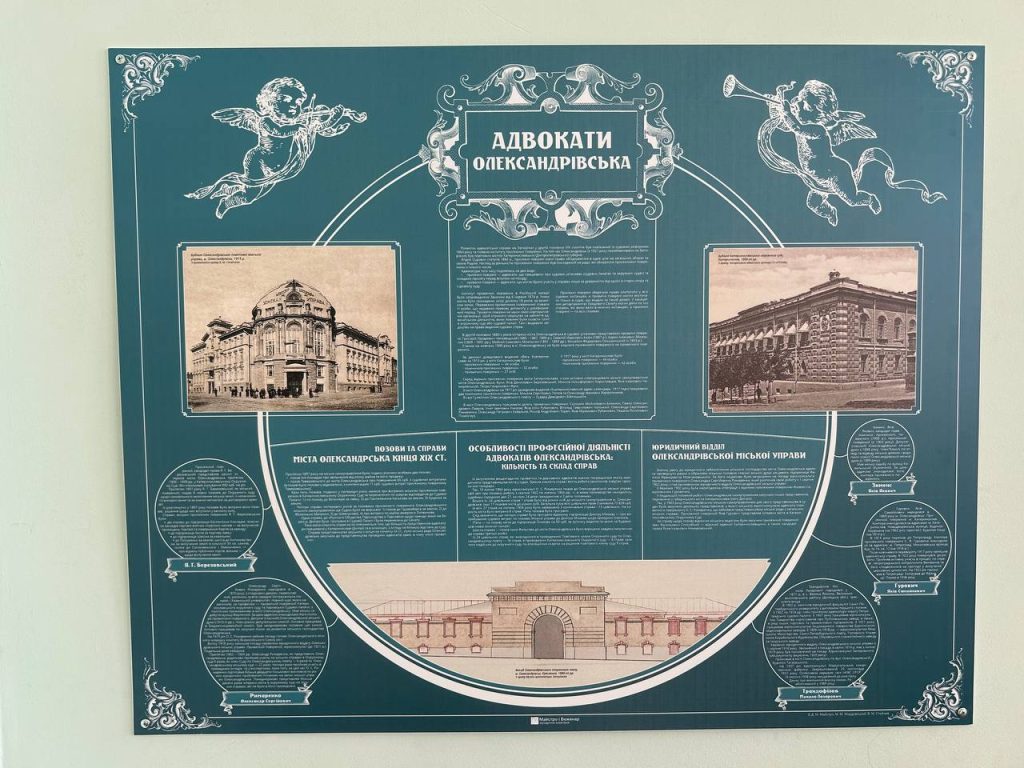 Кабінет-музей вміщує матеріали щодо історії розвитку адвокатури м. Олександрівська у XIX-XX ст, цінні та цікаві фото, інформацію про адвокатів, політиків, меценатів, письменників, релігійних лідерів та суспільних діячів того часу. Відвідувачі можуть ознайомитися із музейними експонатами, друкованим дослідженням з історії адвокатури. Зібрані матеріали – місяці наполегливої праці та кропітких досліджень усіх учасників процесу.