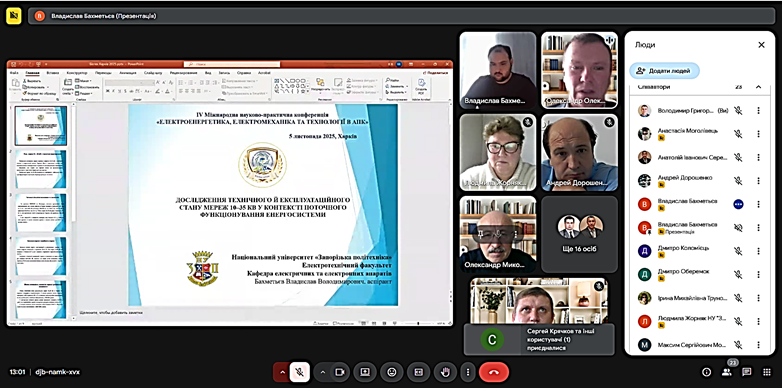 Викладач Жорняк Л. Б. і аспірант Бахметьєв В. В. виступили з доповіддю «Дослідження технічного та експлуатаційного стану мереж 10–35 кВ у контексті поточного функціонування енергосистеми»