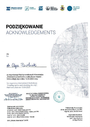 13 квітня 2023 р. професор Ірина Рижова, доцент Ольга Павлюк (НУ «Запорізька політехніка») та професор Ганна Грегорович-Габер (Краківська політехніка) провели майстер-клас «Креативний простір та відновлення міста» зі студентами Краківської політехніки, Жешовської політехніки та Запорізької політехніки.