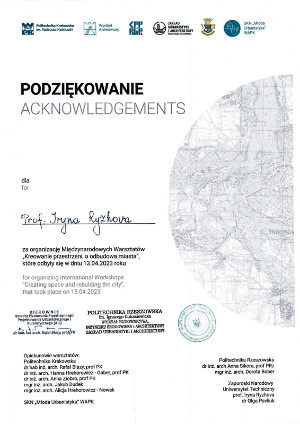 13 квітня 2023 р. професор Ірина Рижова, доцент Ольга Павлюк (НУ «Запорізька політехніка») та професор Ганна Грегорович-Габер (Краківська політехніка) провели майстер-клас «Креативний простір та відновлення міста» зі студентами Краківської політехніки, Жешовської політехніки та Запорізької політехніки.