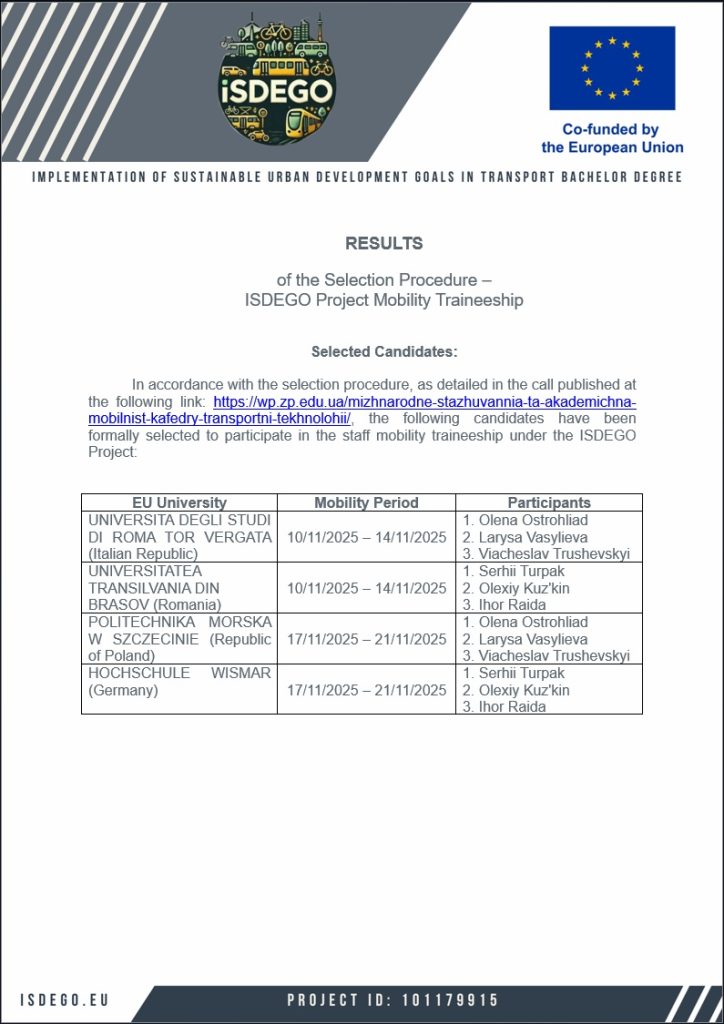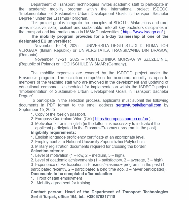Кафедра «Транспортні технології» пропонує науково-педагогічним працівникам взяти участь у програмі академічної мобільності міжнародного проєкту ISDEGO «Впровадження цілей сталого розвитку міст у транспортній галузі на бакалаврському рівні» за програмою Erasmus+.
