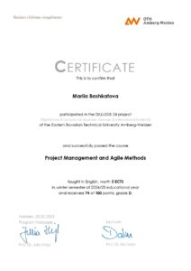 Студентка групи СН-312 Башкатова Марія Павлівна пройшла Міжнародне навчання (курси «Marketing and Sales» та «Project Management»). Програма академічної онлайн мобільності DILLUGIS 24 (Digital Labs & Lectures for Ukrainian, German & International Students). Навчання проходило в онлайн форматі з 1 жовтня 2024 по грудень 2024 (Східнобаварський технічний університет Амберг-Вайден, Німеччина). Наказ № 675-С від 02.10.2024 р.