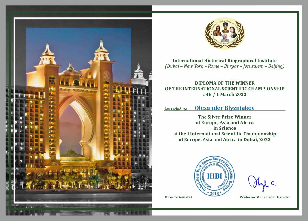 В Об’єднаних Арабських Еміратах, м. Дубаї, з 1 по 28 лютого 2023 року відбувся І Міжнародний науковий Чемпіонат країн Європи, Азії та Африки. Захід був організований Міжнародним історико-біографічним інститутом (The International Historical Biographical Institute (Dubai – New York – Rome – Burgas – Jerusalem – Beijing). В міжнародному Чемпіонаті взяли участь 1027 учасників з 59 країн світу. Роботи були подані з 36 галузей науки. Нагороди отримало 216 науковців. Україна посіла почесне 11 місце.