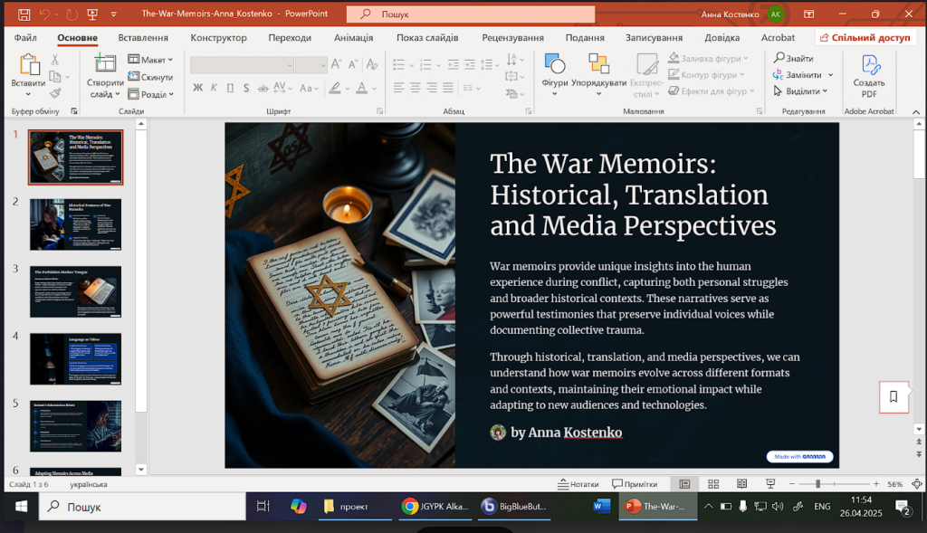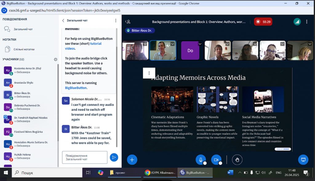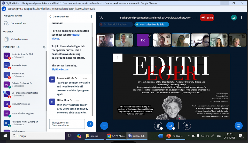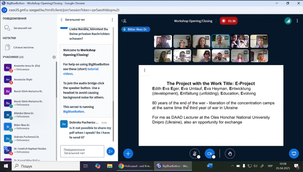 With the participation of lecturers and students from (East) Central European (DE, HU, PL, RO, SK) and Ukrainian universities, a project on Holocaust and war memoirs will be carried out in Hungary, Slovakia and Romania from April to October 2025 to mark the end of the Second World War 80 years ago and the fourth year of Russia’s full-scale war of aggression against Ukraine. Particular attention will be paid to references to multilingualism then and now: the multilingualism of the authors and their environment, the different languages of the memoirs’ target groups and at the same time their possible consideration in the interpretation of the memoirs and their reception. The first kick-off workshop was held today on the basis of Szeged University (Hungary) under the title “The Holocaust and War Memoirs in several languages. Our University was presented by Anna Kostenko who reported on the topic “War Memoirs: Historical, Translation and Media Perspeectives”. The second part of the kick-off workshop will take place on 4 June in the afternoon in Budapest in presence with online contributions. This will be followed on 5 and 6 June by an in-depth scientific discussion in a working group at the Budapest Conference of the Society for Language and Linguistics and the higher education didactic and pedagogical development in September in Prešov and in October in Oradea.