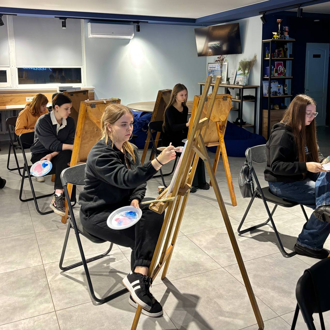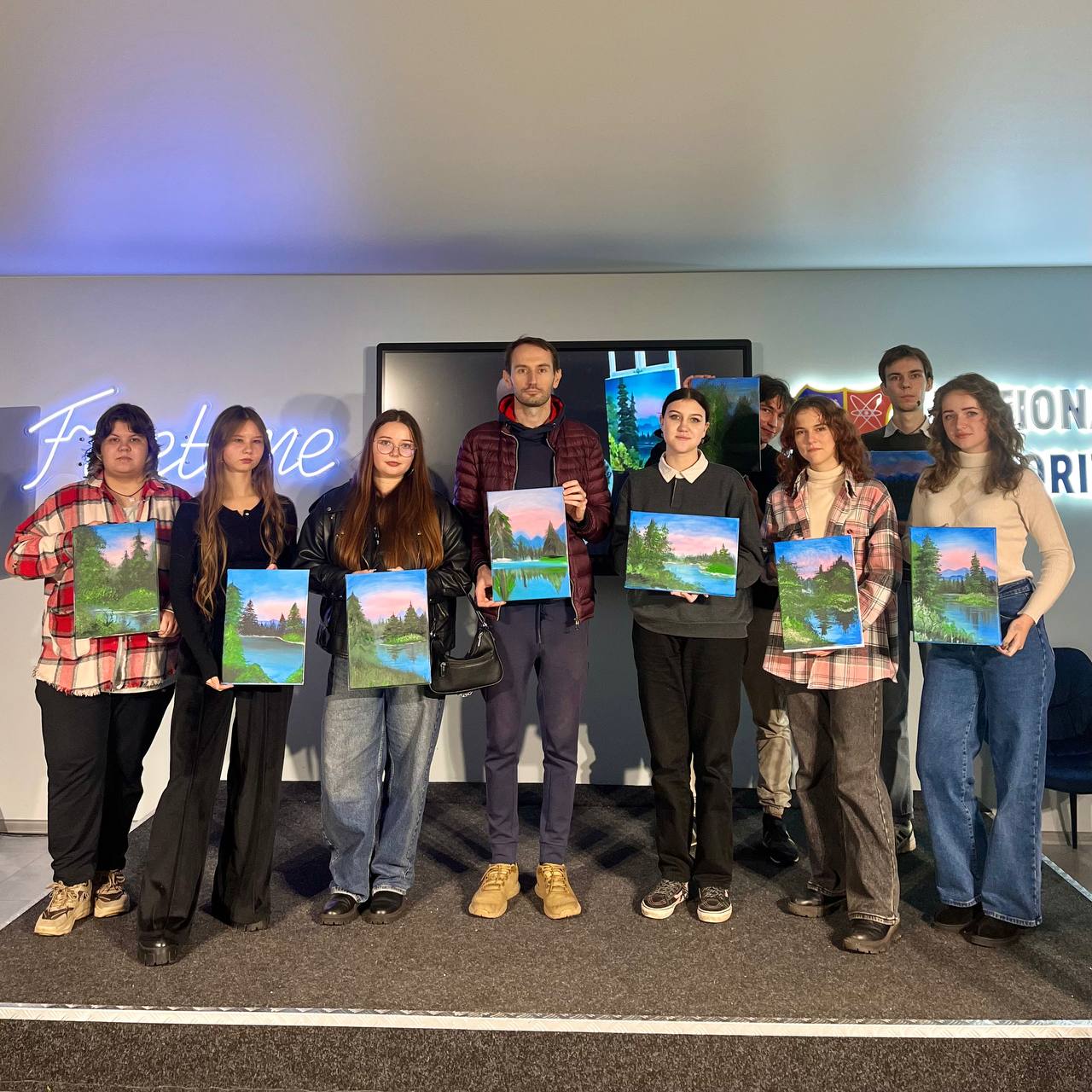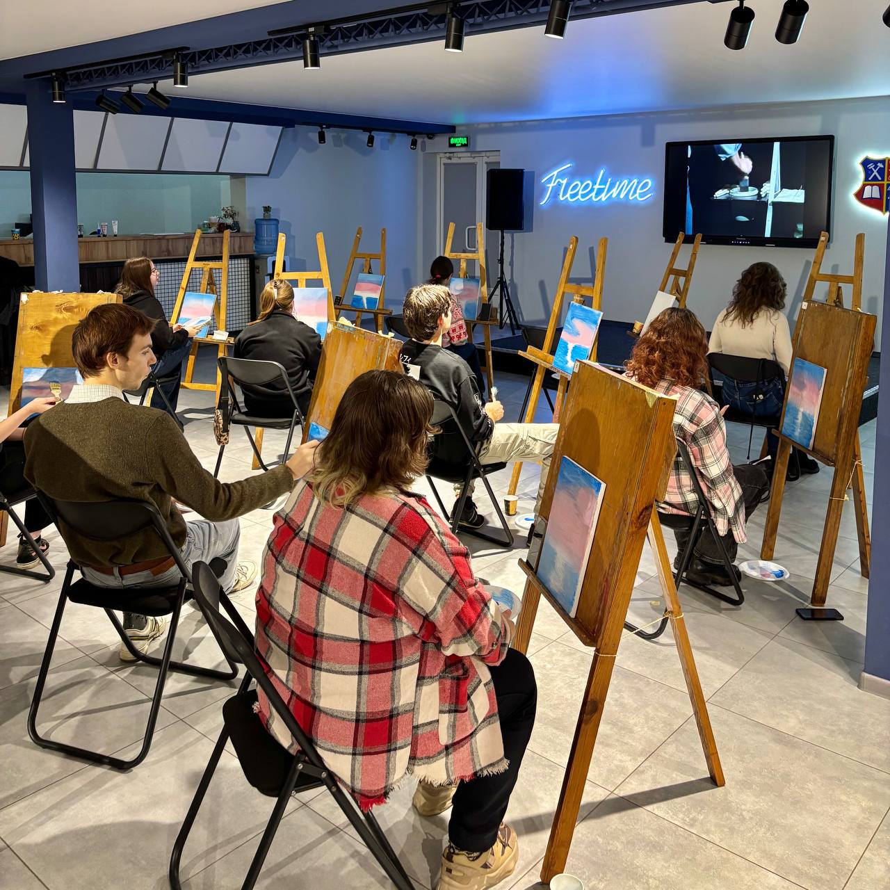 У спокійній та затишній атмосфері студенти занурилися у процес малювання, крок за кроком повторюючи за м’яким голосом художника. Під час арт-вечора кожен відчув себе митцем — хтось уперше тримав пензлик, а хтось вже впевнено малював пейзаж 😍