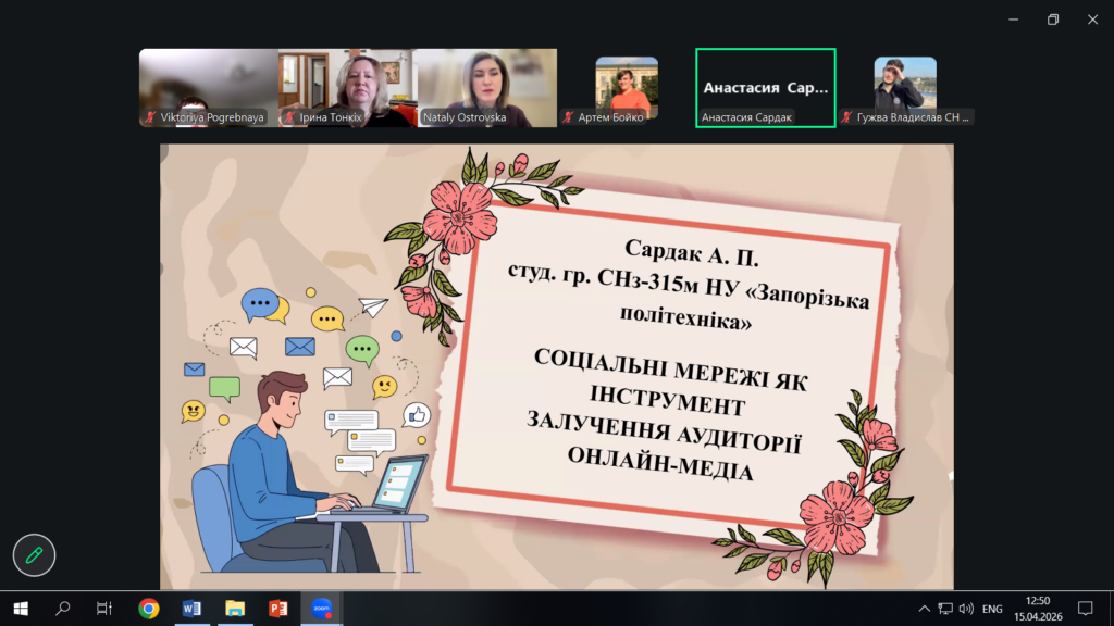 👥 15 квітня 2026 року викладачі та студенти кафедри журналістики взяли участь у секційній роботі Щорічної науково-практичної конференції викладачів, науковців, молодих учених, аспірантів та студентів «Тиждень науки-2026» у НУ «Запорізька політехніка». Виступи та презентації відзначалися актуальністю, глибиною, змістовністю та новими підходами до висвітлення тенденцій розвитку журналістики сьогодення.
