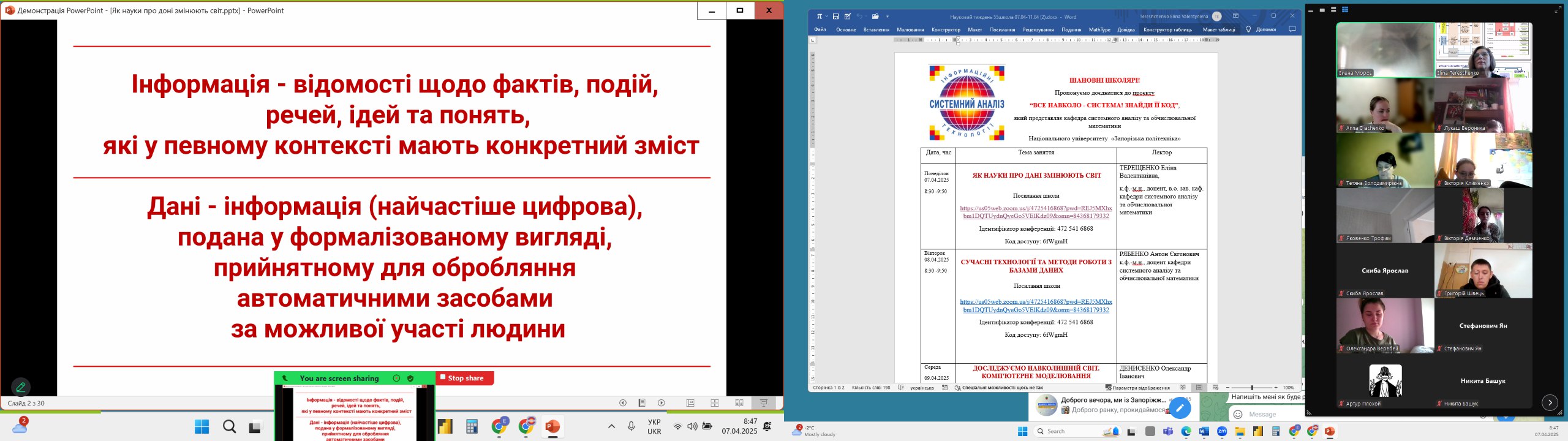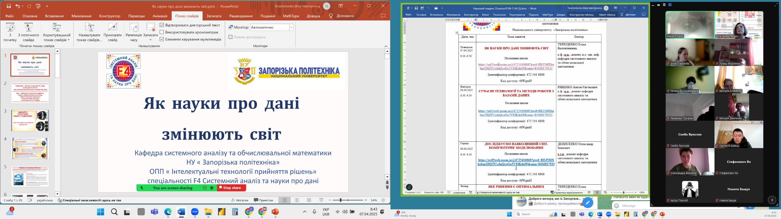З 10 березня по 18 квітня Запорізька політехніка провела 22 унікальні наукові проєкти для учнів 16 шкіл міста: Запорізька гімназія №45, Запорізька гімназія №85, Запорізька спеціалізована школа №100, Запорізька гімназія №93, Запорізька гімназія №106, Запорізька загальноосвітня санаторна школа-інтернат №7 І–II ступенів, Запорізька гімназія №85, Запорізька гімназія «Контакт», Запорізька гімназія №91, Запорізька суспільно-гуманітарна гімназія №27, Запорізький академічний ліцей №46, Запорізька гімназія №55, Хортицький академічний ліцей, Запорізький навчально-виховний комплекс №67, Запорізька гімназія №28 та Запорізька гімназія №2.