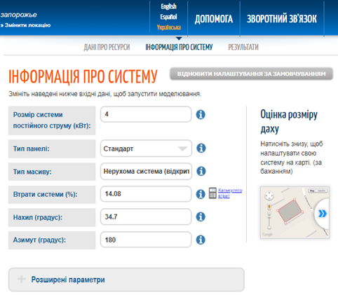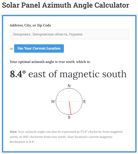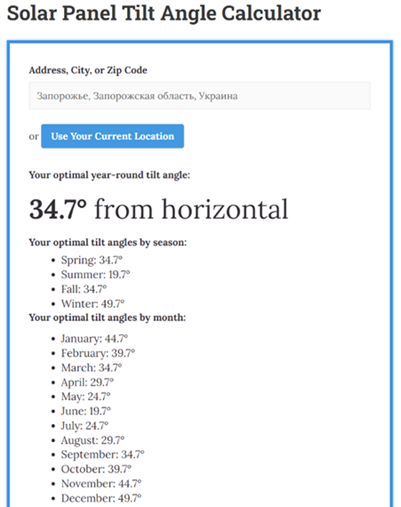Приклад 1 – Розрахунок кута нахилу та азимуту фотоелектричних (PV) панелей Запоріжжя, Запорізька область, Україна.