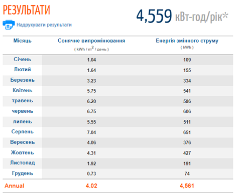 Рис.5 – Результат розрахунку сонячної інсоляції та виробництво електроенергії фотовольтаїчною системою