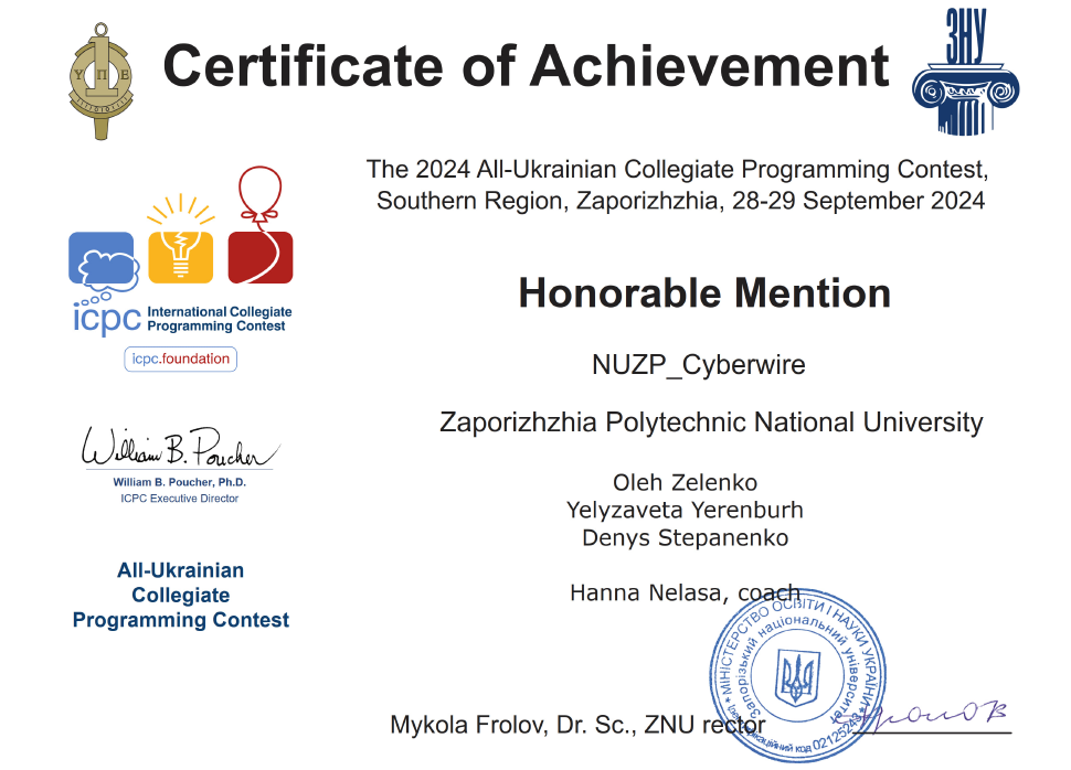 Команда NUZP_Cyberwire у складі капітан Зеленько Олег БК-813, Єренбург Єлизавета БК-813, Степаненко Денис БК-813 прийняла участь у 1 етапі першості України з програмування 2024, який проводився на платформі Algotester – першій в Україні сучасній платформі автоматичного тестування та проведення змагань зі спортивного програмування з навчальними матеріалами у вільному доступі.