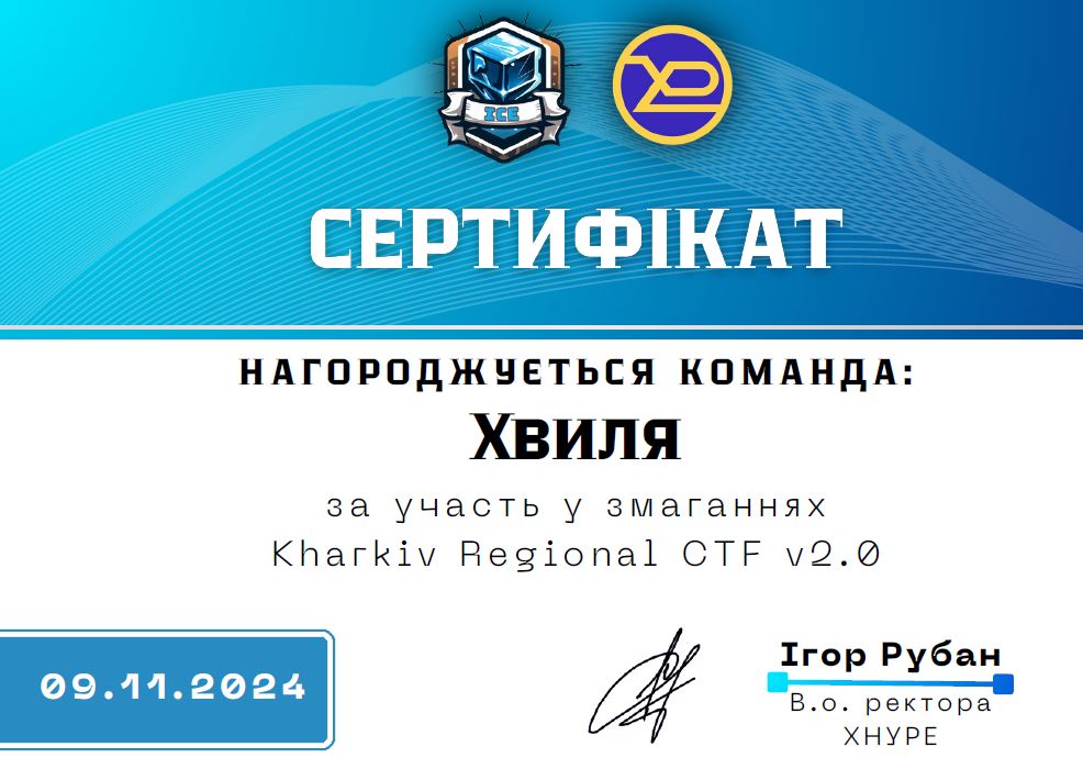 Студенти Зеленько Олег БК-813, Еренбург Єлизавета БК-813, Степаненко Денис БК-813, Малахов Єгор БК-814, Прошкін Григорій БК-814, Голдиш Олександр БК-314сп прийняли участь у змаганнях Kharkiv Regional CTF v2.0, що проводились онлайн на базі Харківського національного університету радіоелектроніки.
