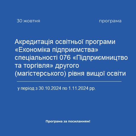Акредитація освітньої програми другого (магістр) рівня вищої освіти «Підприємництво та торгівля» у період з 30.10.2024 по 1.11.2024 рр.