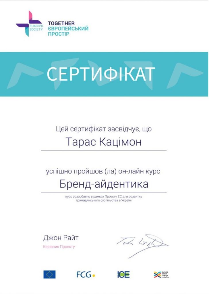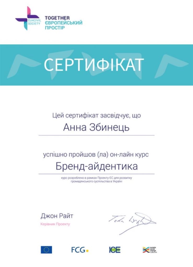 У рамках вивчення дисципліни «Особистий бренд», викладання якої здійснює доцент кафедри Чернова І.В., студентам першого курсу спеціальності 073 “Менеджмент” було запропоновано пройти онлайн-курс «Бренд-айдентика». Курс розроблено в рамках Проєкту ЄС для розвитку громадянського суспільства в Україні. Найактивніші студенти, які успішно опанували навчальний матеріал, отримали відповідні сертифікати міжнародного зразка.