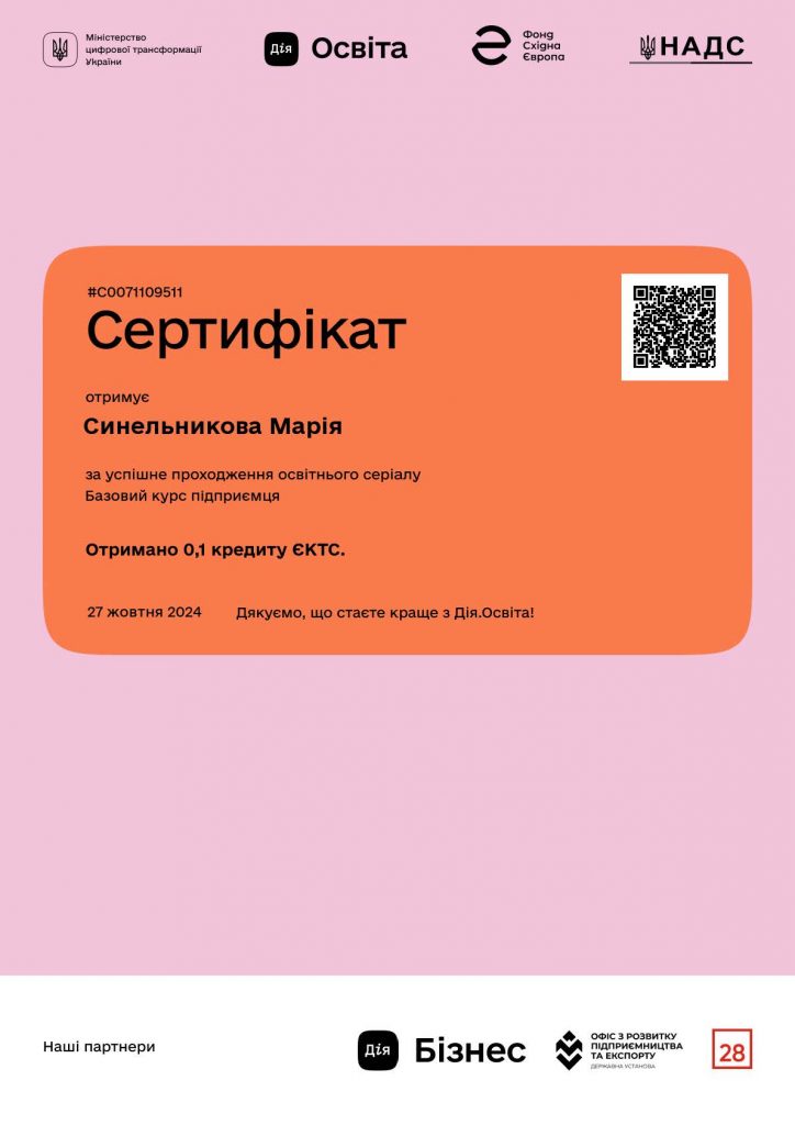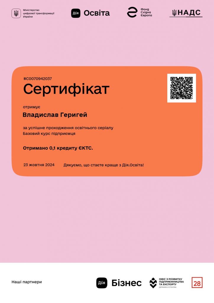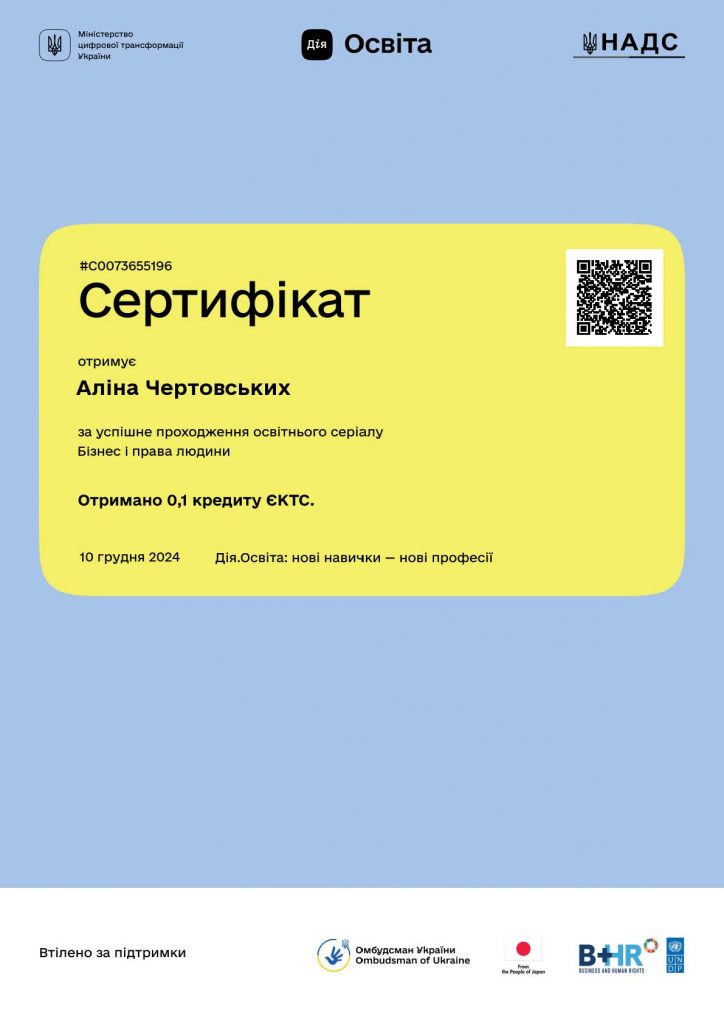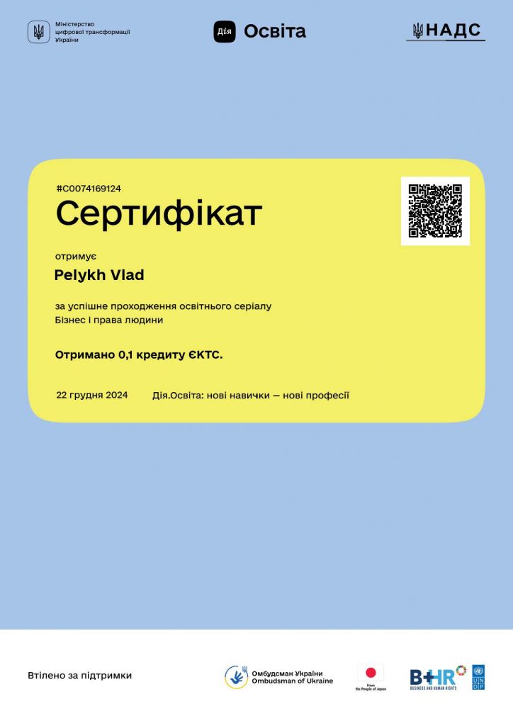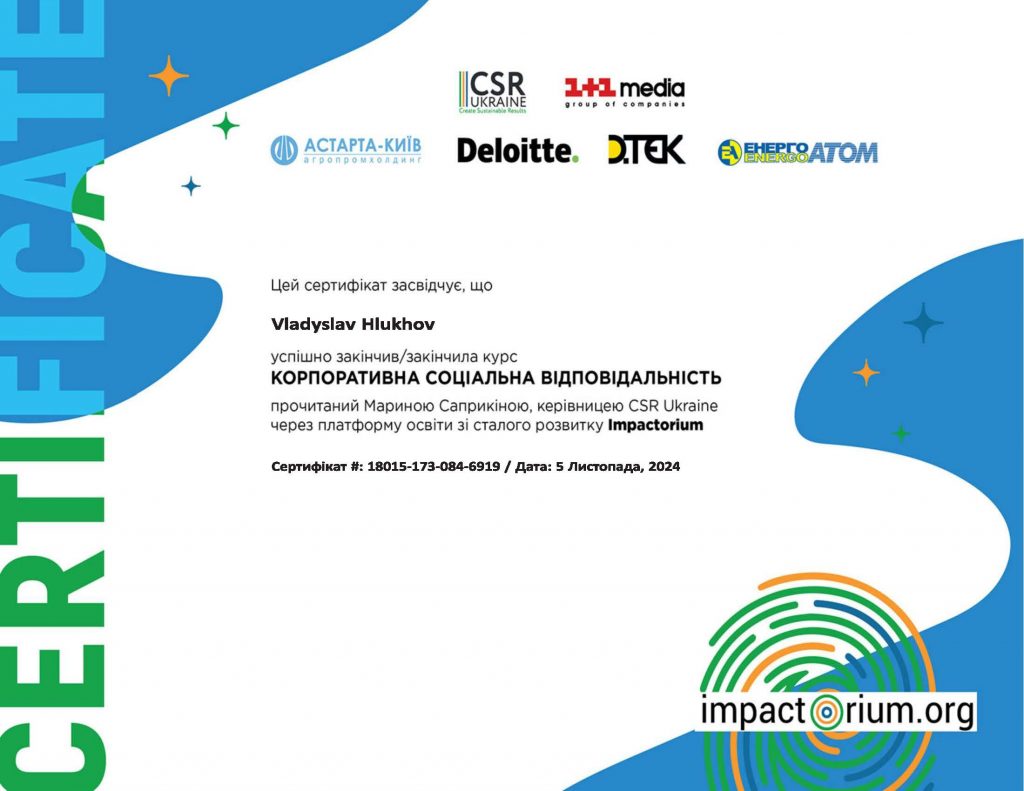 У рамках вивчення дисциплін студент 4 курсу спеціальності 076 “Підприємництво та торгівля” успішно пройшов онлайн-курс «Корпоративна соціальна відповідальність». Курс спрямовано на формування розуміння соціальної ролі бізнесу, відповідального ставлення до працівників, громади та довкілля, відповідно до принципів сталого розвитку.