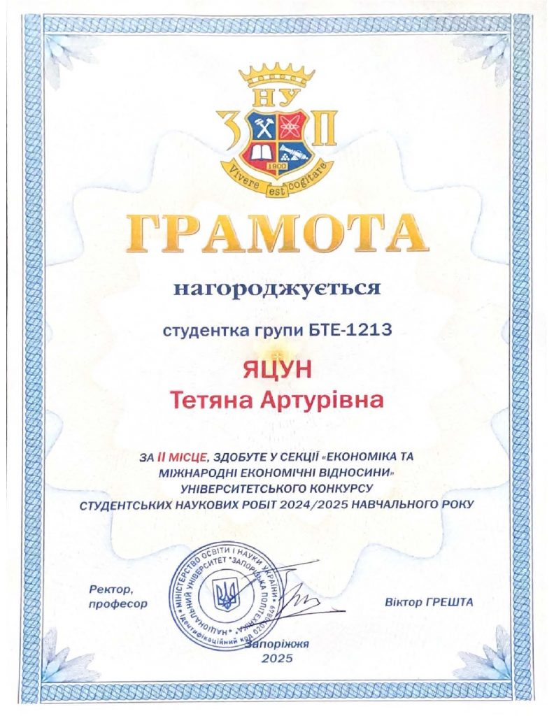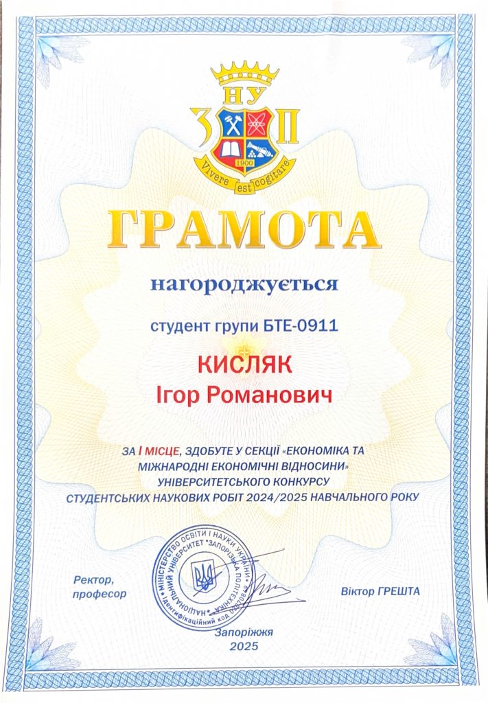 У 2024/2025 навчальному році студенти кафедри Бізнесу та управління взяли активну участь в Університетському конкурсі студентських наукових робіт у секції «Економіка та міжнародні економічні відносини».
