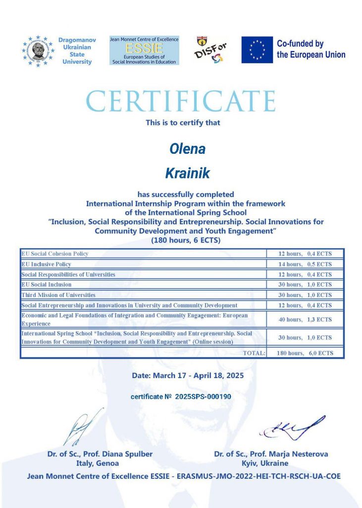 У період з 17 березня по 18 квітня 2025 року викладачі кафедри Бізнесу та управління Крайнік О., Сергієнко Т. та студент 1 курсу спеціальності 073 «Менеджмент» Куріс А. взяли участь у Міжнародній весняній школі «Інклюзія, соціальна відповідальність та підприємництво. Соціальні інновації для розвитку громад та залучення молоді».