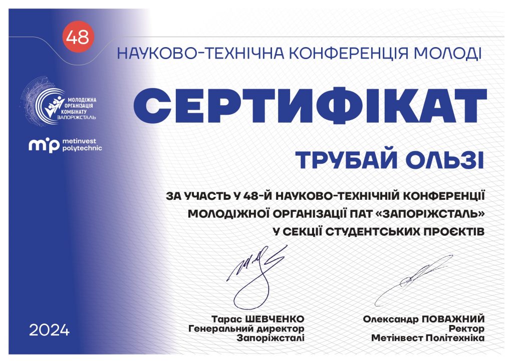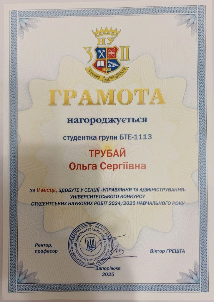 На початку грудня 2024 р. в НУ «Запорізька політехніка» відбулась конференція присвячена підсумкам наукової роботи студентів під час Вузівського етапу Всеукраїнського конкурсу студентських наукових робіт (секція «Управління та адміністрування») .