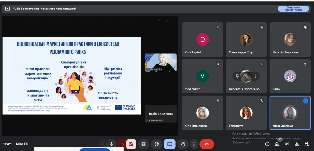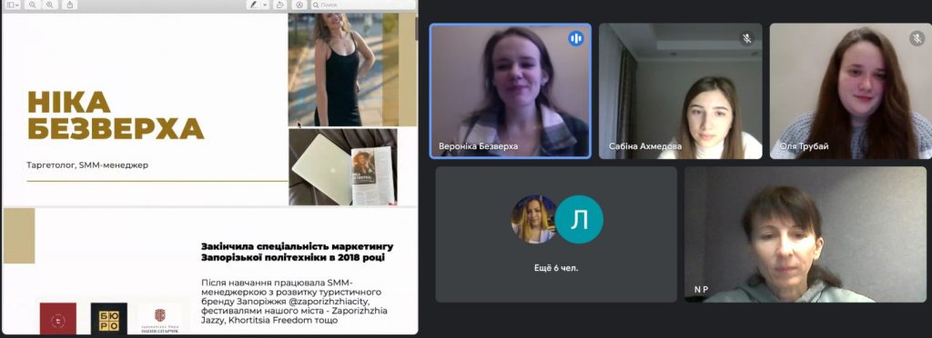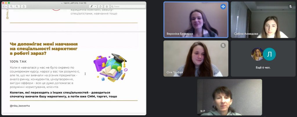 Коротка екскурсія у світ професії була настільки захоплюючою що вийшла далеко за межі однієї пари. Пані Ніка не просто розказала про ази професії чи ті можливості які вона надає для роботи, розвитку та заробітку. Вона поділилась професійними секретами, розповіла про тонкощі налаштування реклами на різних платформах, про підводні камені рекламування та дала порати як їх обійти. Як практик, доповідач розказала, що є важливим ще до початку роботи із клієнтом та чітко виділила «червоні кнопки» на які слід звернути увагу. Ці поради стануть корисними майбутнім фахівцям. На завершення зустрічі пані Ніка наголосила на актуальності роботи у сфері СММ-маркетингу саме під час війни та роботи в умовах онлайн та окреслила основні тренди у сій сфері. Її основна рекомендація – вірити у себе, не боятись перешкод, постійно розвиватись та підтримувати дружні зв’язки із колегами та замовниками.