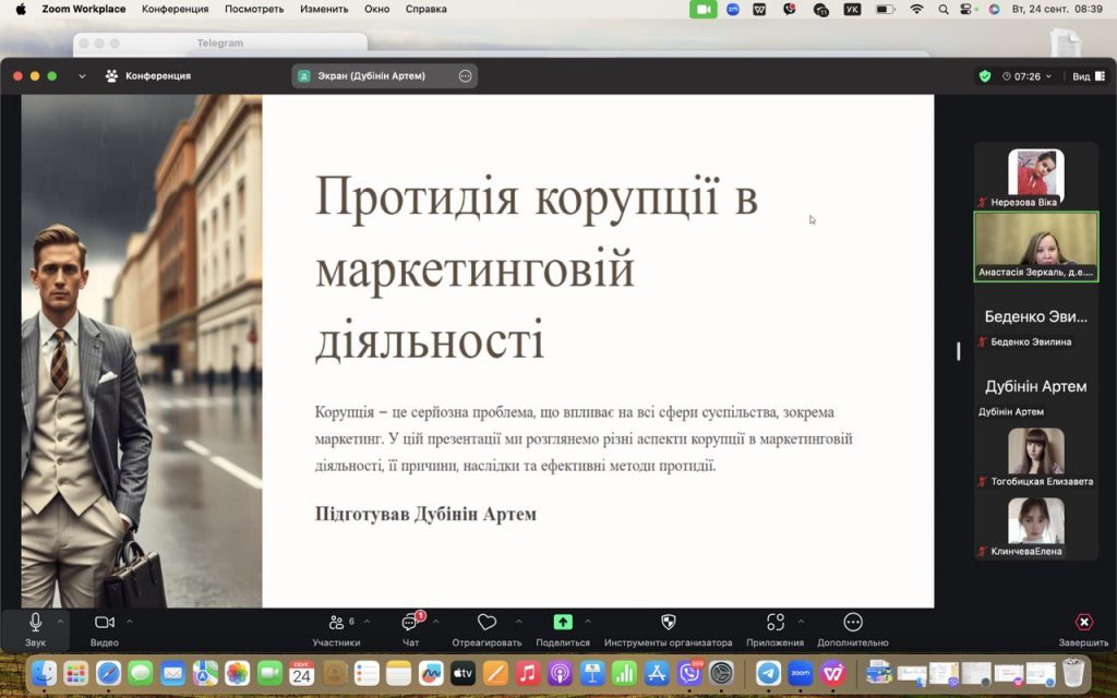 24 вересня 2024 року в межах діяльності студентського наукового гуртка кафедри маркетингу та логістики “Я – маркетолог. Я – логіст.” відбулося засідання на тему “Шляхи подолання ризиків недоброчесності та корупції в професії маркетолога”. На заході студенти та викладачі обговорили актуальні проблеми етики в маркетинговій діяльності, механізми запобігання недоброчесній поведінці та корупційним практикам у сфері маркетингу.