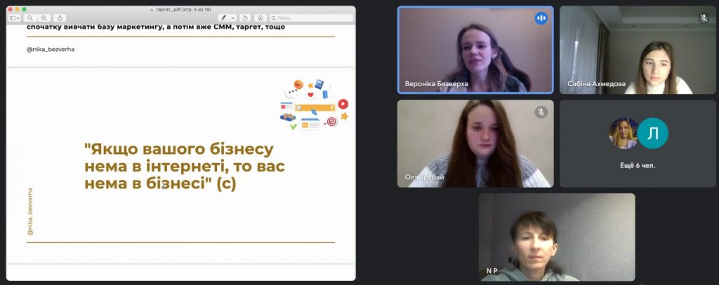 Було задано багато уточнюючих питань на які отримано детальні відповіді. Пані Ніка надала презентаційні матеріали для тих студентів які не мали змоги доєднатись до зустрічі та обіцяла підтримку тим кого зацікавила робота у сфері СММ-маркетингу та таргетингу.