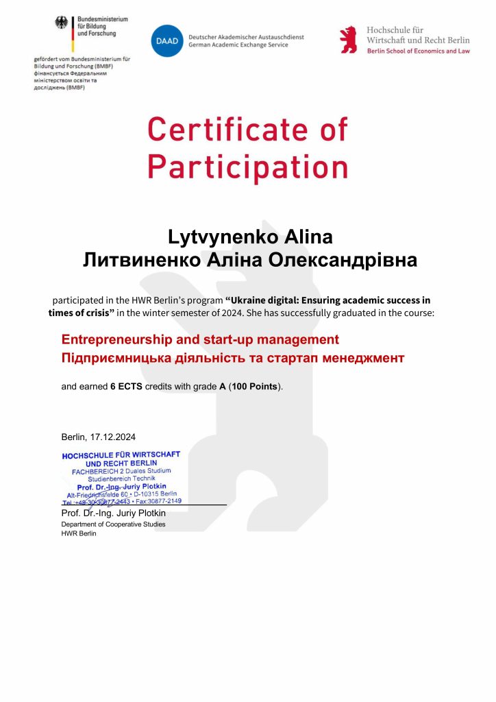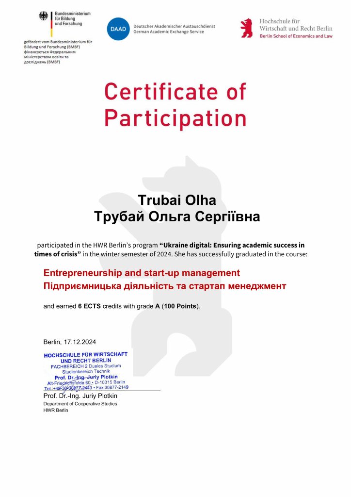Вітаємо студенток другого курсу, групи БТЕ-1113, Трубай Ольгу та Литвиненко Аліну із успішним завершенням курсу DAAD «Ukraine digital: Ensuring academic success in times of crisis» тривалістю семестр (6 ECTS) та отриманням сертифікатів за курсом « Entrepreneurship and start-up management».