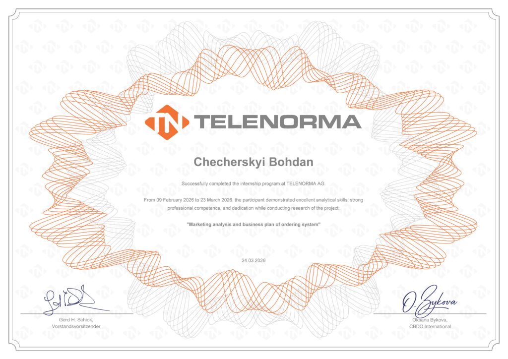 У рамках договору про співпрацю з компанією TELENORMA AG (Німеччина) студенти 4 курсу освітніх програм кафедри «Маркетинг» та «Організація торгівлі та комерційна логістика» успішно пройшли фахову практику.