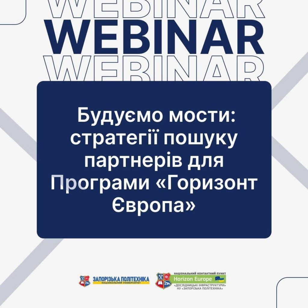- 29 квітня Національний контактний пункт програми «Горизонт Європа» за напрямом «Дослідницькі інфраструктури» провів вебінар «Будуємо мости: стратегії пошуку партнерів для програми Horizon Europe». Захід було організовано у співпраці з НКП за напрямом WIDERA — «Розширення участі та зміцнення Європейського дослідницького простору» ?