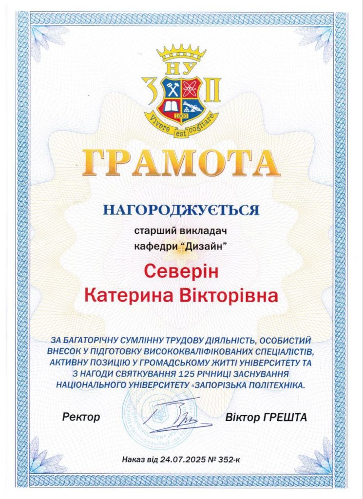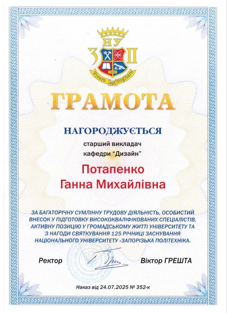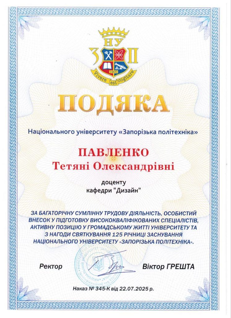 Працівників кафедри дизайну відзначили грамотами та подяками за багаторічну сумлінну трудову діяльність, особистий внесок у підготовку висококваліфікованих спеціалістів, за активну позицію у громадському житті університету та з нагоди святкування 125 річниці заснування Національного університету “Запорізька політехніка”