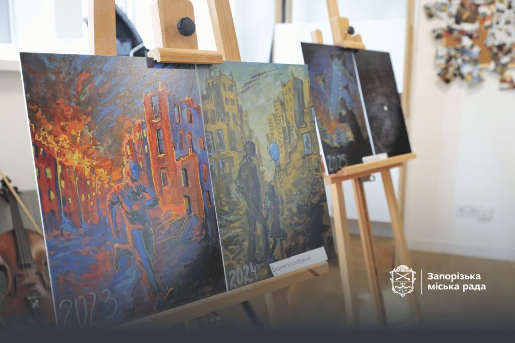 Студентка кафедри Дизайн Дарина Воскобойник – переможниця Youth4Peace в категорії індивідуальних міжнародних робіт. Її серія з шести картин ілюструє особисту — і водночас спільну для всіх українців — подорож: від звичайного життя, крізь щоденний хаос війни, до крихкої надії. Цей драматичний шлях художниця виразно передає в динаміці барв і сюжетів: теплі, пастельні кольори мирних днів змінюються агресивними бризками фарб, в яких упізнаються наслідки ракетних атак на місто. Остання картина — чорна ніч, пронизана однією лише цяткою світла. Це спроба студентки зазирнути в 2026 рік: вона про невизначеність, і все ж присутність надії.