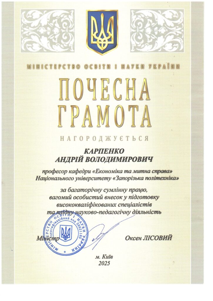 Вітаємо професора Андрія Карпенка з отримання Почесної грамоти